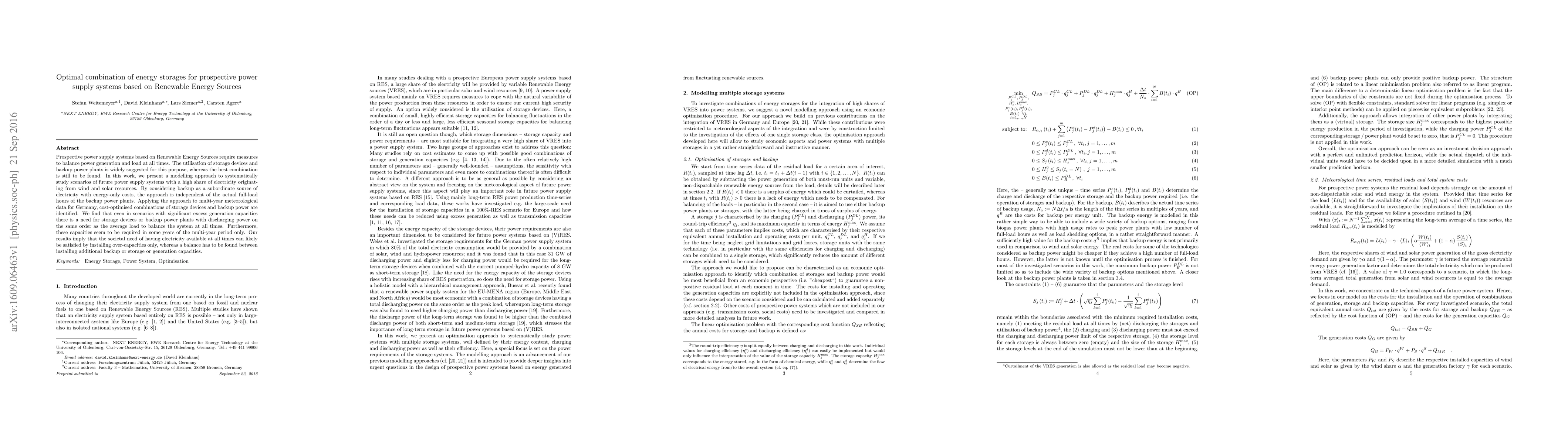 This paper proposes a modelling approach to determine optimal combinations of energy storages and backup power plants for future power supply systems heavily reliant on renewable energy sources like wind and solar. The study finds that while excess generation capacities exist, there is still a need for storage devices or backup power plants to balance the system, suggesting a balance between over-capacities and additional storage or backup installations is essential.