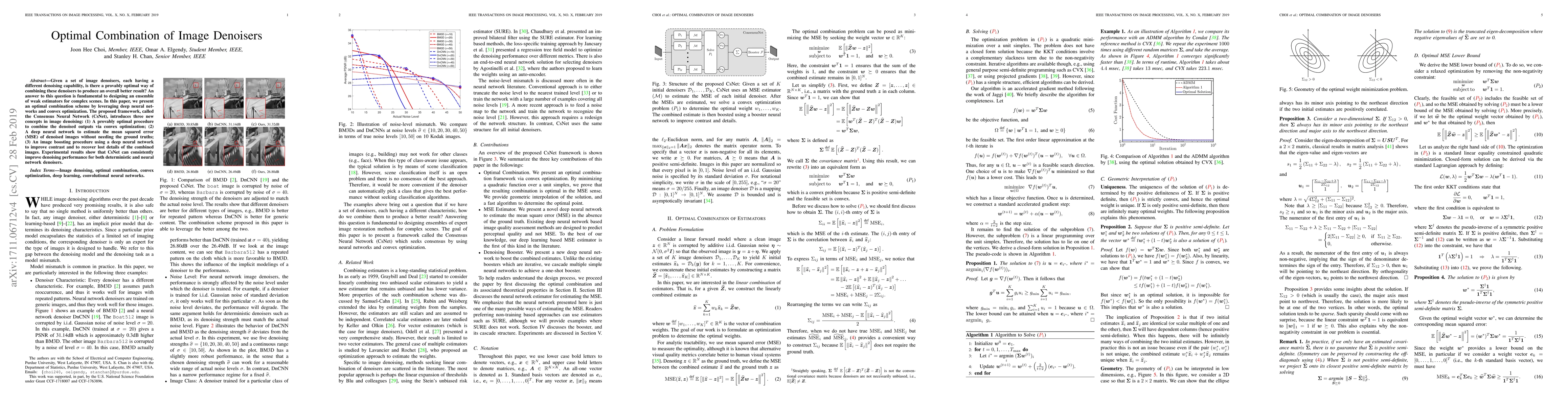 Given a set of image denoisers, each having a different denoising capability, is there a provably optimal way of combining these denoisers to produce an overall better result? An answer to this question is fundamental to designing an ensemble of weak estimators for complex scenes. In this paper, we present an optimal combination scheme by leveraging deep neural networks and convex optimization. The proposed framework, called the Consensus Neural Network (CsNet), introduces three new concepts in image denoising: (1) A provably optimal procedure to combine the denoised outputs via convex optimization; (2) A deep neural network to estimate the mean squared error (MSE) of denoised images without needing the ground truths; (3) An image boosting procedure using a deep neural network to improve contrast and to recover lost details of the combined images. Experimental results show that CsNet can consistently improve denoising performance for both deterministic and neural network denoisers.