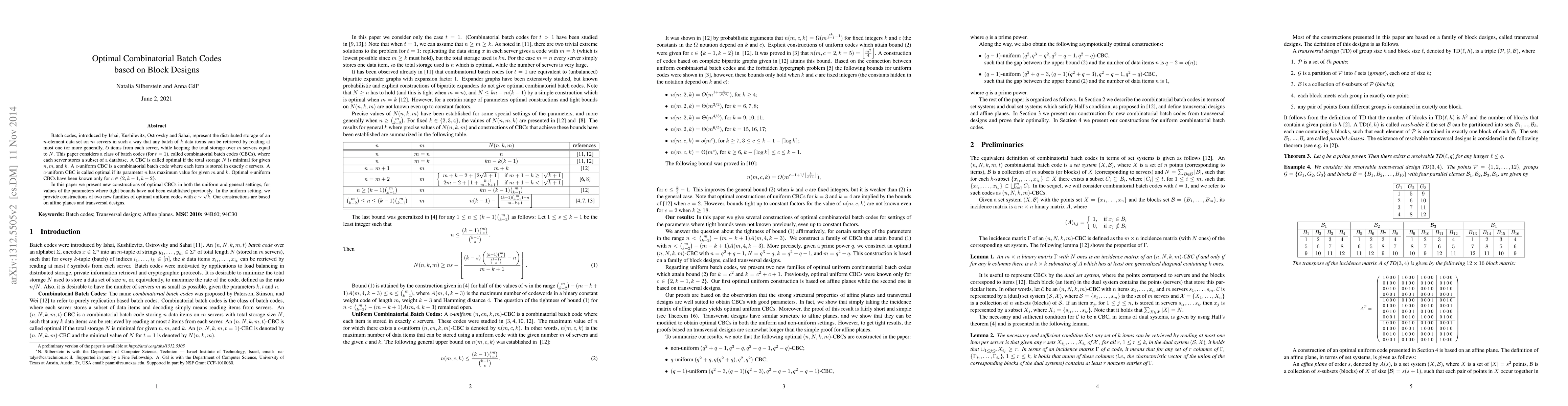 Researchers developed new constructions for optimal combinatorial batch codes in both uniform and general settings, expanding known bounds for certain parameters.