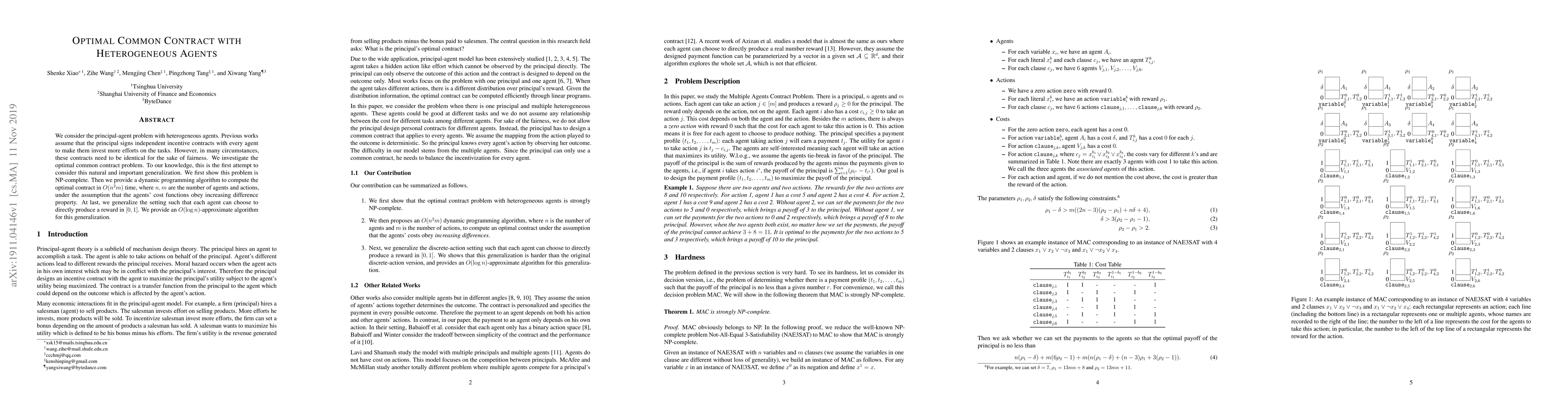This research introduces and solves the optimal common contract problem for heterogeneous agents, a generalization of previous works on individual incentive contracts. The problem is proven NP-complete, and a dynamic programming algorithm is provided for optimal solution in O(n^2m) time, assuming increasing difference property of agents' cost functions. The study also offers an O(log n)-approximate algorithm for a generalization allowing agents to directly produce rewards.