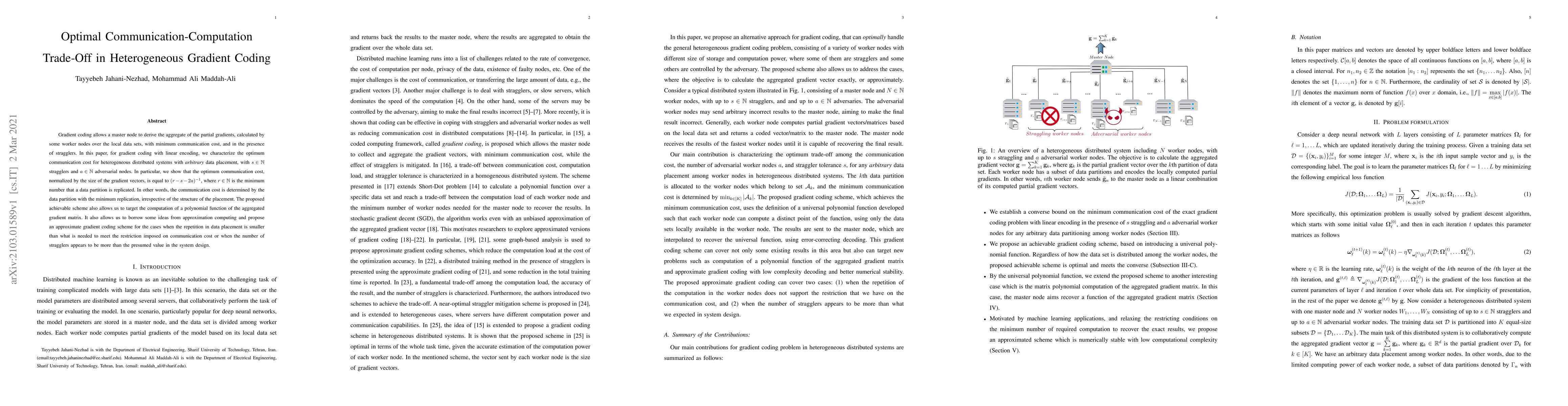 Gradient coding allows a master node to derive the aggregate of the partial gradients, calculated by some worker nodes over the local data sets, with minimum communication cost, and in the presence of stragglers. In this paper, for gradient coding with linear encoding, we characterize the optimum communication cost for heterogeneous distributed systems with \emph{arbitrary} data placement, with $s \in \mathbb{N}$ stragglers and $a \in \mathbb{N}$ adversarial nodes. In particular, we show that the optimum communication cost, normalized by the size of the gradient vectors, is equal to $(r-s-2a)^{-1}$, where $r \in \mathbb{N}$ is the minimum number that a data partition is replicated. In other words, the communication cost is determined by the data partition with the minimum replication, irrespective of the structure of the placement. The proposed achievable scheme also allows us to target the computation of a polynomial function of the aggregated gradient matrix. It also allows us to borrow some ideas from approximation computing and propose an approximate gradient coding scheme for the cases when the repetition in data placement is smaller than what is needed to meet the restriction imposed on communication cost or when the number of stragglers appears to be more than the presumed value in the system design.