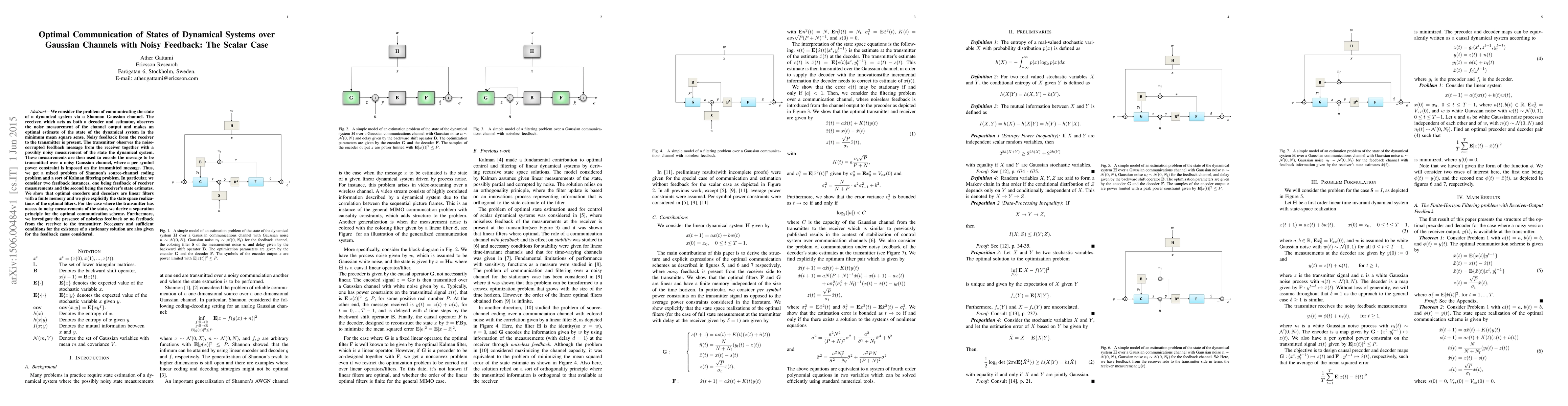 This paper explores optimal communication of dynamical system states over Gaussian channels with noisy feedback, focusing on the scalar case. It derives optimal linear filters for encoding and decoding under power constraints, and provides a separation principle for scenarios with noisy state measurements.