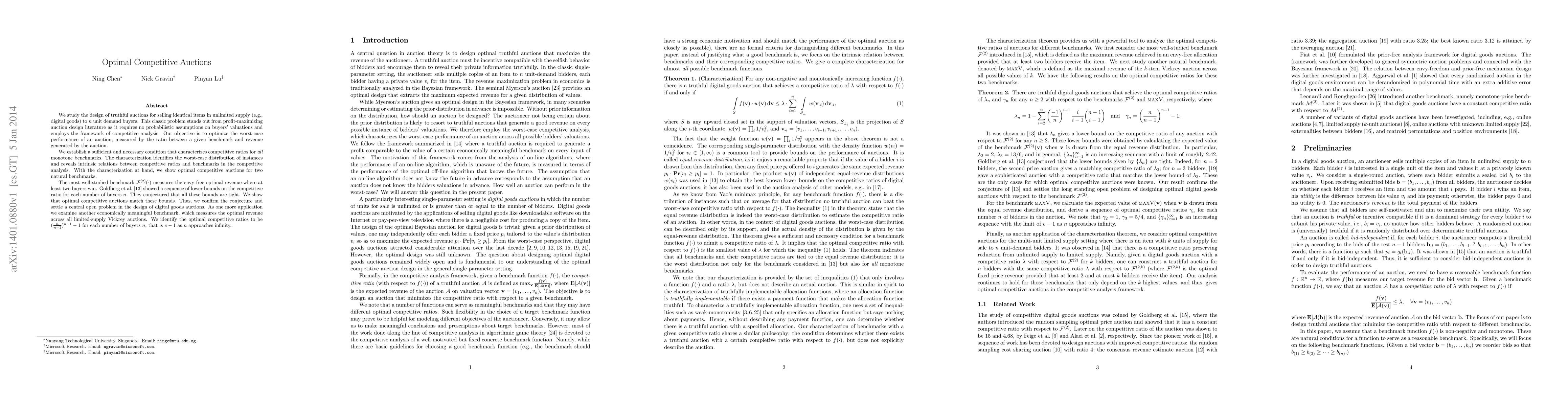 We study the design of truthful auctions for selling identical items in unlimited supply (e.g., digital goods) to n unit demand buyers. This classic problem stands out from profit-maximizing auction design literature as it requires no probabilistic assumptions on buyers' valuations and employs the framework of competitive analysis. Our objective is to optimize the worst-case performance of an auction, measured by the ratio between a given benchmark and revenue generated by the auction. We establish a sufficient and necessary condition that characterizes competitive ratios for all monotone benchmarks. The characterization identifies the worst-case distribution of instances and reveals intrinsic relations between competitive ratios and benchmarks in the competitive analysis. With the characterization at hand, we show optimal competitive auctions for two natural benchmarks. The most well-studied benchmark $\mathcal{F}^{(2)}(\cdot)$ measures the envy-free optimal revenue where at least two buyers win. Goldberg et al. [13] showed a sequence of lower bounds on the competitive ratio for each number of buyers n. They conjectured that all these bounds are tight. We show that optimal competitive auctions match these bounds. Thus, we confirm the conjecture and settle a central open problem in the design of digital goods auctions. As one more application we examine another economically meaningful benchmark, which measures the optimal revenue across all limited-supply Vickrey auctions. We identify the optimal competitive ratios to be $(\frac{n}{n-1})^{n-1}-1$ for each number of buyers n, that is $e-1$ as $n$ approaches infinity.