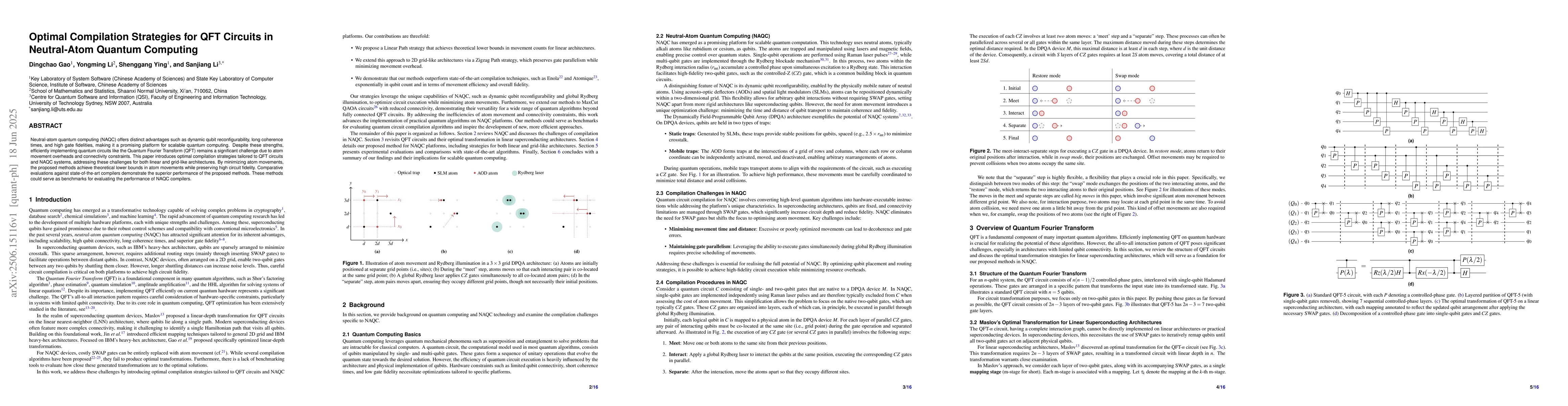 Neutral-atom quantum computing (NAQC) offers distinct advantages such as dynamic qubit reconfigurability, long coherence times, and high gate fidelities, making it a promising platform for scalable quantum computing. Despite these strengths, efficiently implementing quantum circuits like the Quantum Fourier Transform (QFT) remains a significant challenge due to atom movement overheads and connectivity constraints. This paper introduces optimal compilation strategies tailored to QFT circuits and NAQC systems, addressing these challenges for both linear and grid-like architectures. By minimizing atom movements, the proposed methods achieve theoretical lower bounds in atom movements while preserving high circuit fidelity. Comparative evaluations against state-of-the-art compilers demonstrate the superior performance of the proposed methods. These methods could serve as benchmarks for evaluating the performance of NAQC compilers.