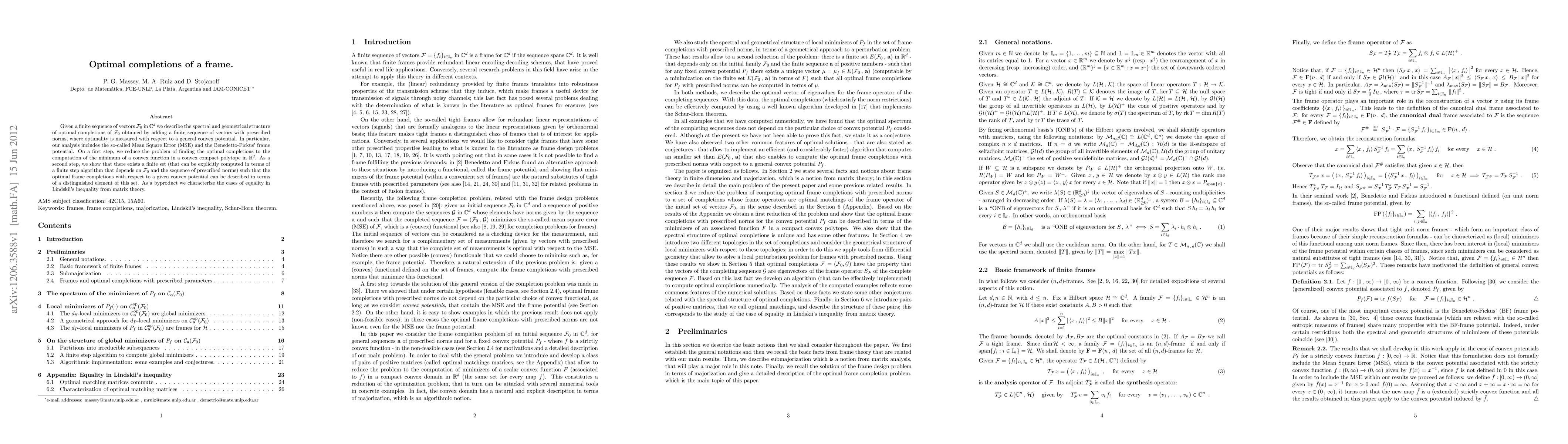 Given a finite sequence of vectors $\mathcal F_0$ in $\C^d$ we describe the spectral and geometrical structure of optimal completions of $\mathcal F_0$ obtained by adding a finite sequence of vectors with prescribed norms, where optimality is measured with respect to a general convex potential. In particular, our analysis includes the so-called Mean Square Error (MSE) and the Benedetto-Fickus' frame potential. On a first step, we reduce the problem of finding the optimal completions to the computation of the minimum of a convex function in a convex compact polytope in $\R^d$. As a second step, we show that there exists a finite set (that can be explicitly computed in terms of a finite step algorithm that depends on $\cF_0$ and the sequence of prescribed norms) such that the optimal frame completions with respect to a given convex potential can be described in terms of a distinguished element of this set. As a byproduct we characterize the cases of equality in Lindskii's inequality from matrix theory.