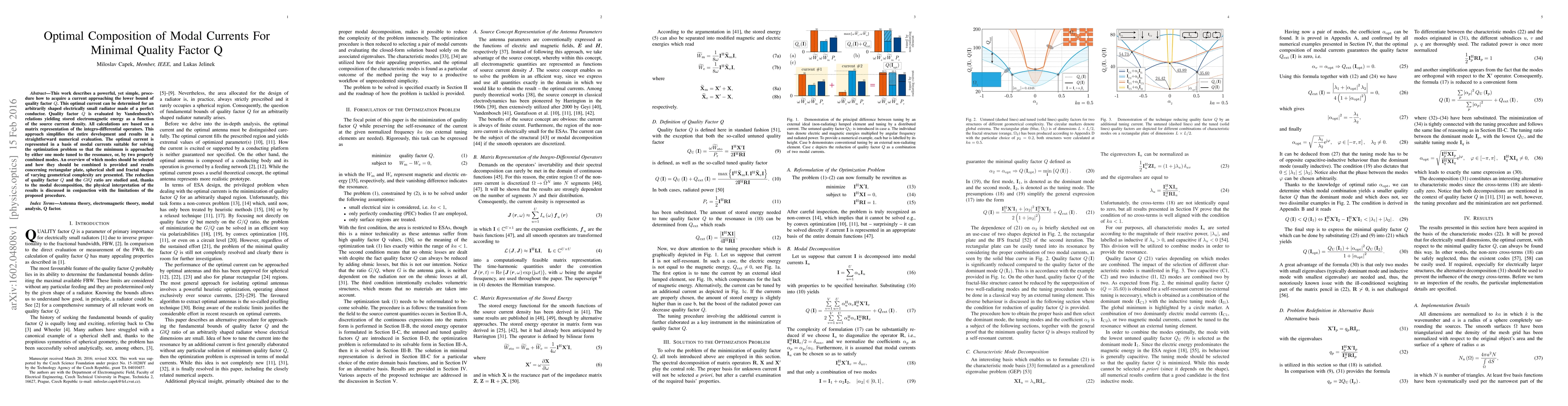 This paper presents a method to determine optimal current compositions for minimizing the quality factor Q in electrically small radiators, using modal currents and matrix representation of integro-differential operators. The approach allows for either a single mode or a combination of two modes to achieve minimal Q, with results analyzed for various shapes.
