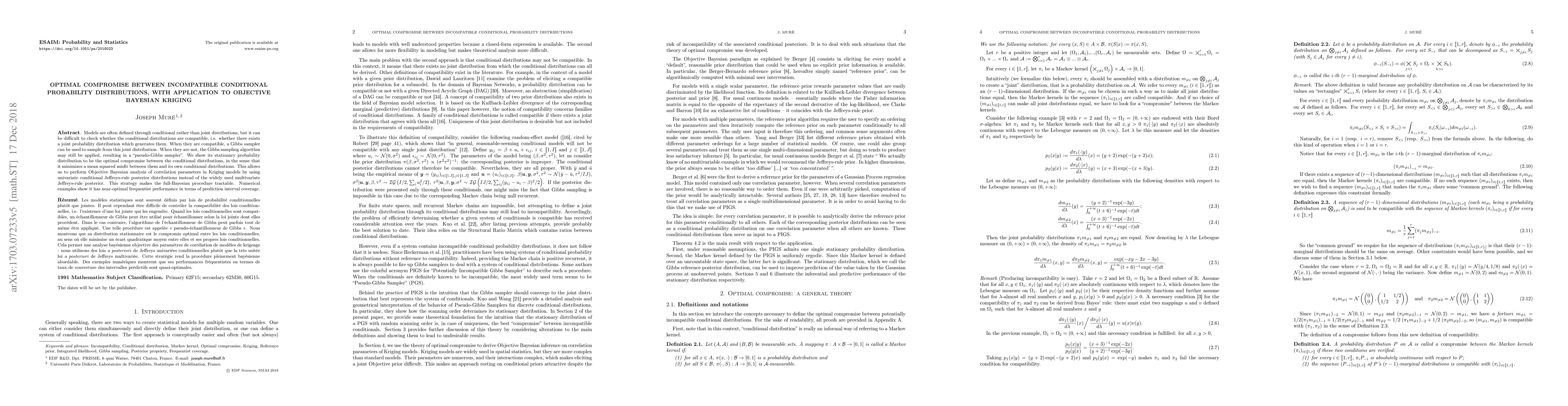 This research introduces a method to check compatibility of conditional probability distributions and, when incompatible, uses a 'pseudo-Gibbs sampler' to find the optimal compromise. This approach is applied to Objective Bayesian Kriging, making full-Bayesian procedures more tractable and demonstrating near-optimal frequentist prediction interval coverage in numerical examples.