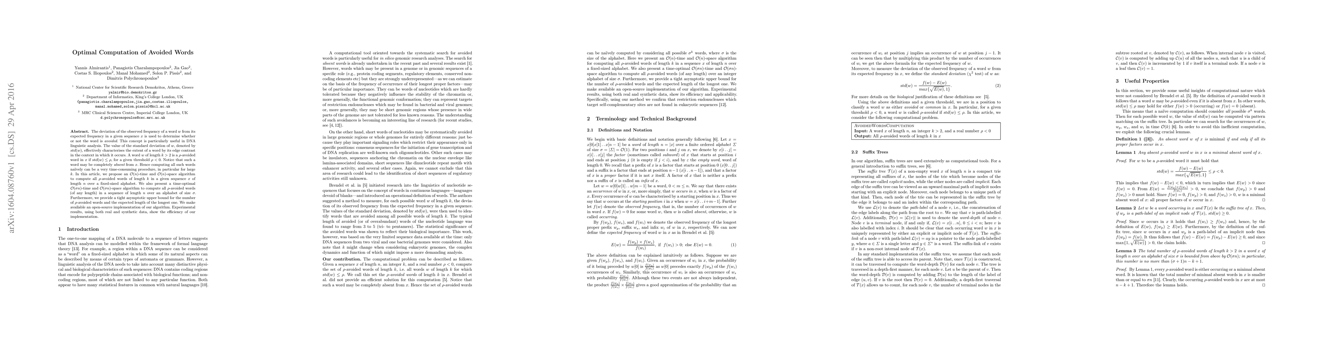 The deviation of the observed frequency of a word $w$ from its expected frequency in a given sequence $x$ is used to determine whether or not the word is avoided. This concept is particularly useful in DNA linguistic analysis. The value of the standard deviation of $w$, denoted by $std(w)$, effectively characterises the extent of a word by its edge contrast in the context in which it occurs. A word $w$ of length $k>2$ is a $\rho$-avoided word in $x$ if $std(w) \leq \rho$, for a given threshold $\rho < 0$. Notice that such a word may be completely absent from $x$. Hence computing all such words na\"{\i}vely can be a very time-consuming procedure, in particular for large $k$. In this article, we propose an $O(n)$-time and $O(n)$-space algorithm to compute all $\rho$-avoided words of length $k$ in a given sequence $x$ of length $n$ over a fixed-sized alphabet. We also present a time-optimal $O(\sigma n)$-time and $O(\sigma n)$-space algorithm to compute all $\rho$-avoided words (of any length) in a sequence of length $n$ over an alphabet of size $\sigma$. Furthermore, we provide a tight asymptotic upper bound for the number of $\rho$-avoided words and the expected length of the longest one. We make available an open-source implementation of our algorithm. Experimental results, using both real and synthetic data, show the efficiency of our implementation.