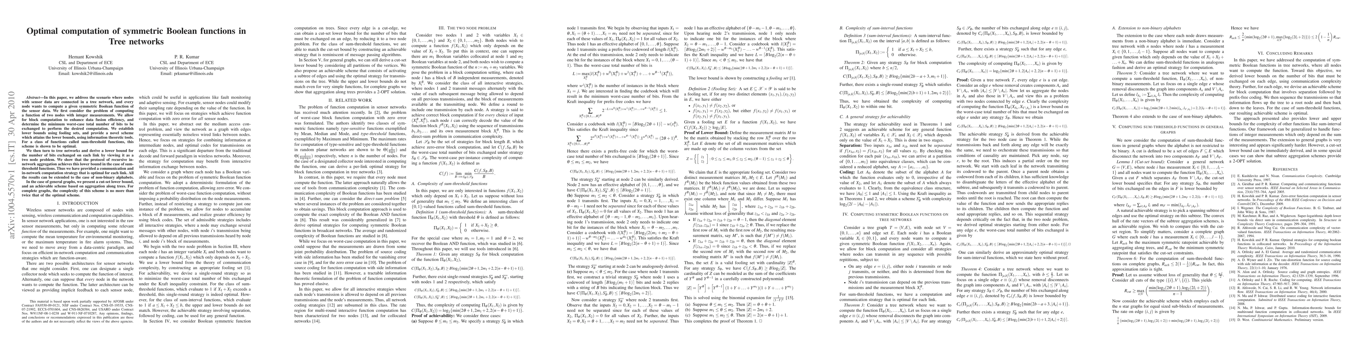 This paper develops optimal communication strategies for computing symmetric Boolean functions in tree networks, determining the minimum number of bits required for data fusion. It presents a recursive in-network aggregation protocol that achieves optimal bit exchange for sum-threshold functions, extending results to non-binary alphabets and general graphs.