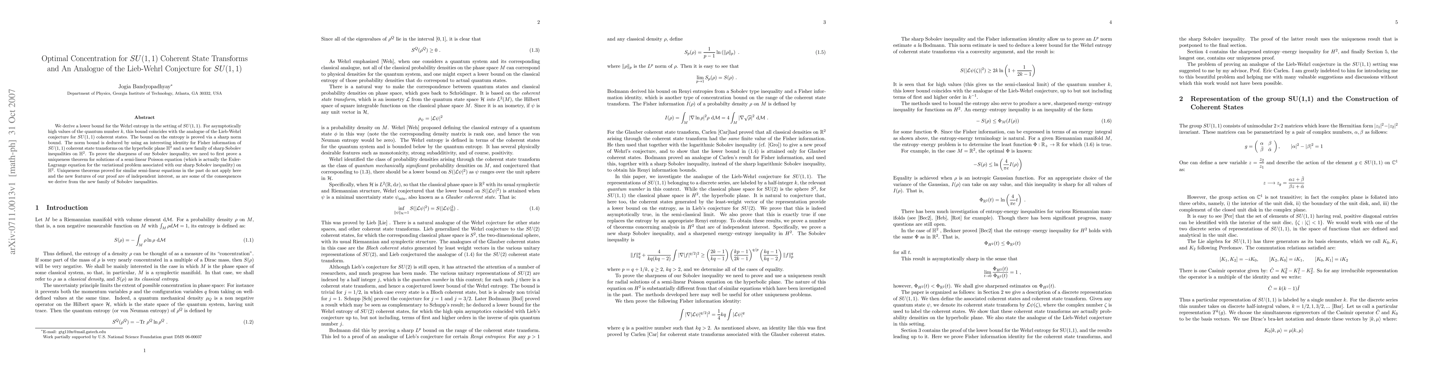 We derive a lower bound for the Wehrl entropy in the setting of SU(1,1). For asymptotically high values of the quantum number k, this bound coincides with the analogue of the Lieb-Wehrl conjecture for SU(1,1) coherent states. The bound on the entropy is proved via a sharp norm bound. The norm bound is deduced by using an interesting identity for Fisher information of SU(1,1) coherent state transforms and a new family of sharp Sobolev inequalities on the hyperbolic plane. To prove the sharpness of our Sobolev inequality, we need to first prove a uniqueness theorem for solutions of a semi-linear Poisson equation (which is actually the Euler-Lagrange equation for the variational problem associated with our sharp Sobolev inequality) on the hyperbolic plane. Uniqueness theorems proved for similar semi-linear equations in the past do not apply here and the new features of our proof are of independent interest, as are some of the consequences we derive from the new family of Sobolev inequalities.