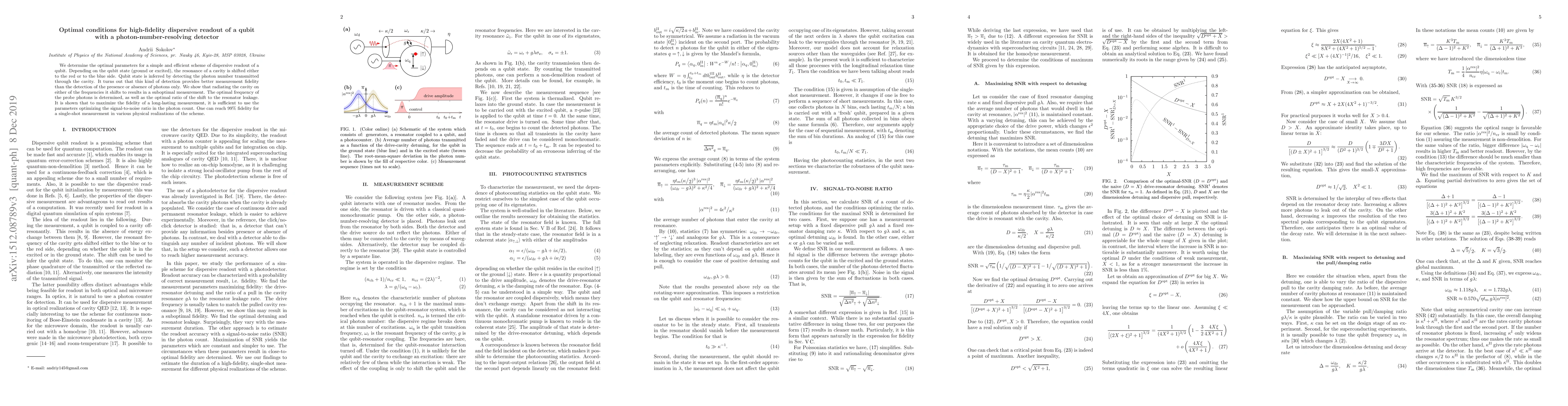 This paper identifies optimal parameters for dispersive readout of a qubit using a photon-number-resolving detector, achieving 99% fidelity. It finds that detecting photon number, rather than presence/absence, enhances measurement fidelity, and determines the best probe frequency and shift ratio for optimal signal-to-noise ratio.