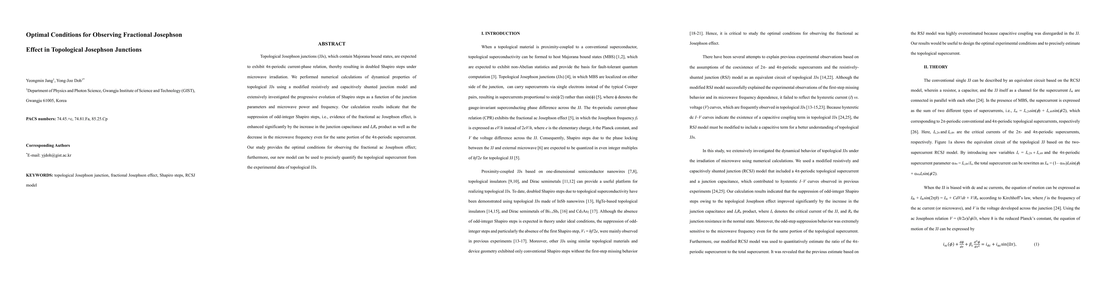 This paper investigates optimal conditions for observing the fractional Josephson effect in topological Josephson junctions using numerical calculations. It reveals that increased junction capacitance, higher IcRn product, and lower microwave frequency enhance the suppression of odd-integer Shapiro steps, thus facilitating the observation of this effect.