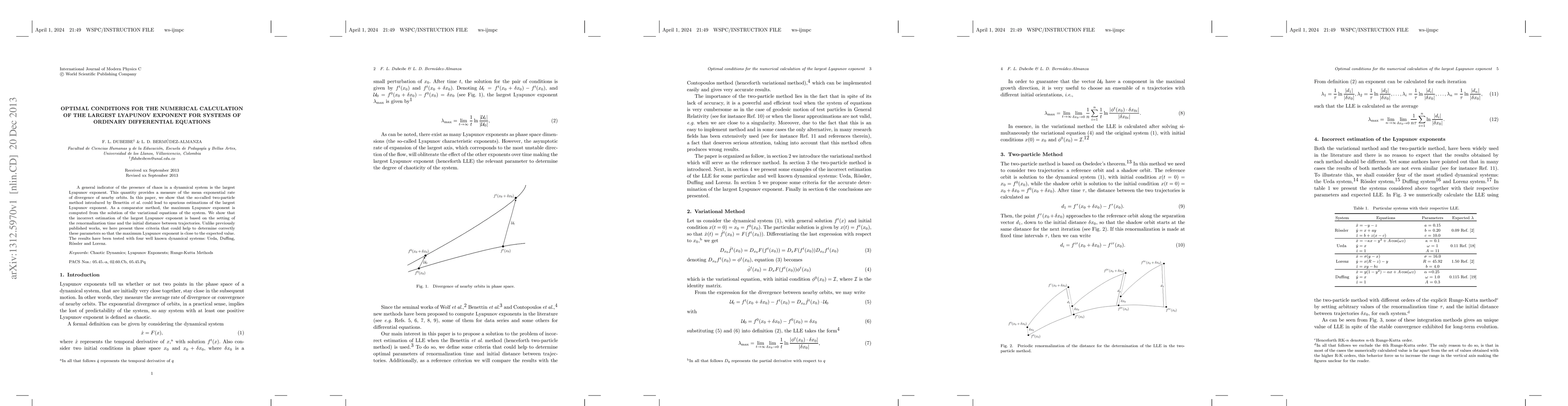 This paper investigates optimal conditions for calculating the largest Lyapunov exponent in chaotic systems, identifying issues with the two-particle method. It proposes three criteria to correctly set the renormalization time and initial distance, validated through comparisons with variational equation solutions across four dynamical systems.