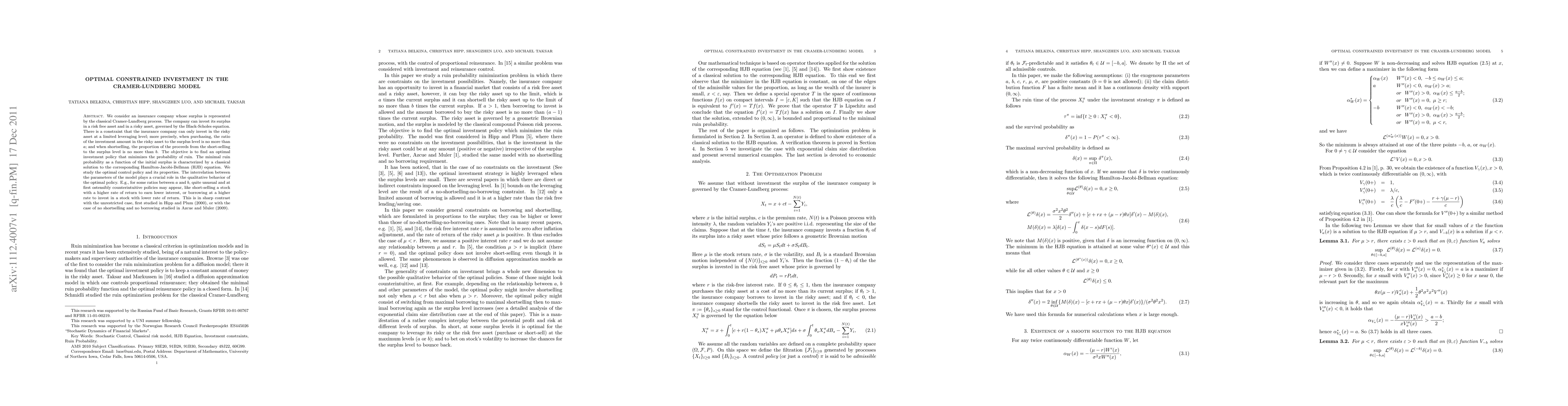 We consider an insurance company whose surplus is represented by the classical Cramer-Lundberg process. The company can invest its surplus in a risk free asset and in a risky asset, governed by the Black-Scholes equation. There is a constraint that the insurance company can only invest in the risky asset at a limited leveraging level; more precisely, when purchasing, the ratio of the investment amount in the risky asset to the surplus level is no more than a; and when shortselling, the proportion of the proceeds from the short-selling to the surplus level is no more than b. The objective is to find an optimal investment policy that minimizes the probability of ruin. The minimal ruin probability as a function of the initial surplus is characterized by a classical solution to the corresponding Hamilton-Jacobi-Bellman (HJB) equation. We study the optimal control policy and its properties. The interrelation between the parameters of the model plays a crucial role in the qualitative behavior of the optimal policy. E.g., for some ratios between a and b, quite unusual and at first ostensibly counterintuitive policies may appear, like short-selling a stock with a higher rate of return to earn lower interest, or borrowing at a higher rate to invest in a stock with lower rate of return. This is in sharp contrast with the unrestricted case, first studied in Hipp and Plum (2000), or with the case of no shortselling and no borrowing studied in Azcue and Muler (2009).