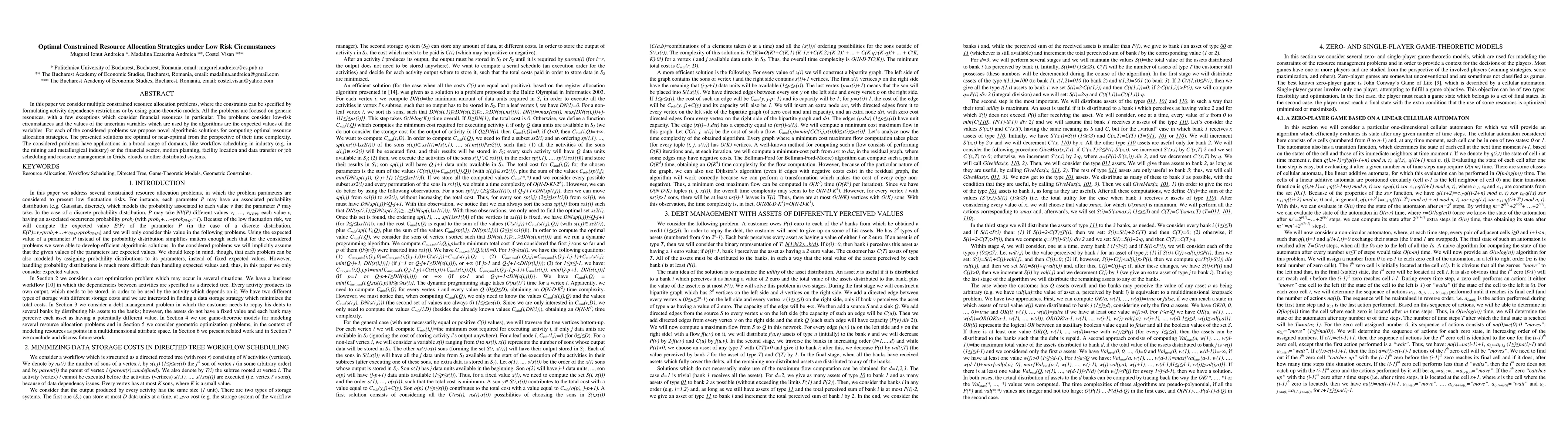 This paper explores optimal resource allocation strategies under low-risk conditions, proposing novel algorithms for solving constrained resource allocation problems. The solutions are optimal or near-optimal in terms of time complexity and have applications in various domains including workflow scheduling, financial sectors, and resource management in distributed systems.