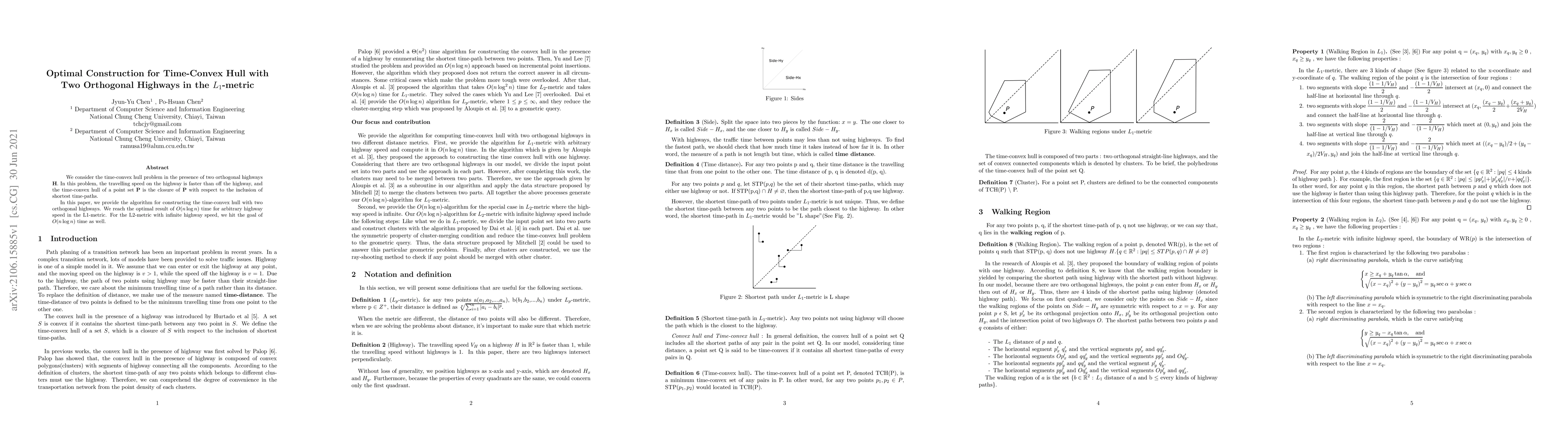 This paper presents an algorithm for constructing the time-convex hull of a point set in the presence of two orthogonal highways, achieving optimal O(n log n) time complexity. The algorithm works under both L1 and L2 metrics, with varying highway speeds.