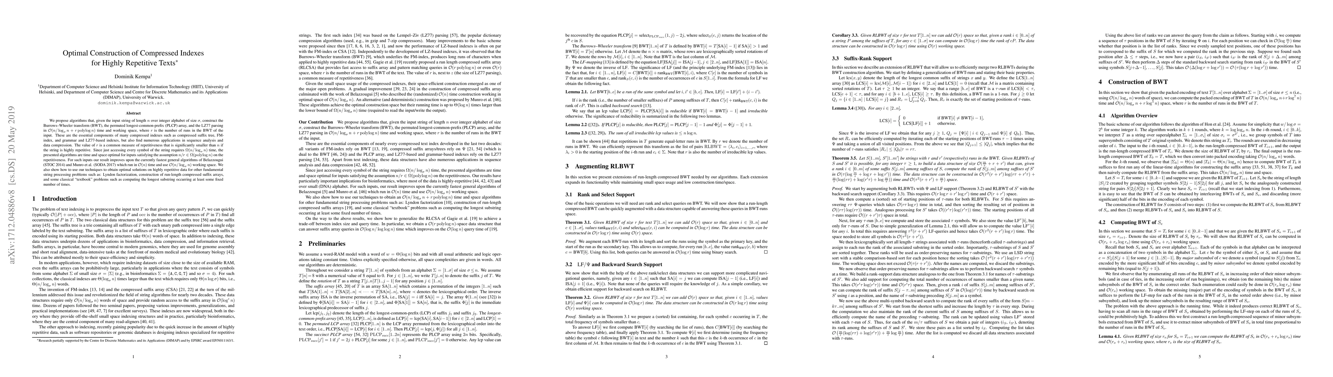This paper proposes optimal algorithms for constructing compressed indexes for highly repetitive texts, achieving $O(n/\log_{\sigma}n+r\,{\rm polylog}\,n)$ time and space complexity for essential components like BWT, PLCP array, and LZ77 parsing, where $r$ is the number of runs in the BWT. This improves upon previous general algorithms for highly repetitive inputs.