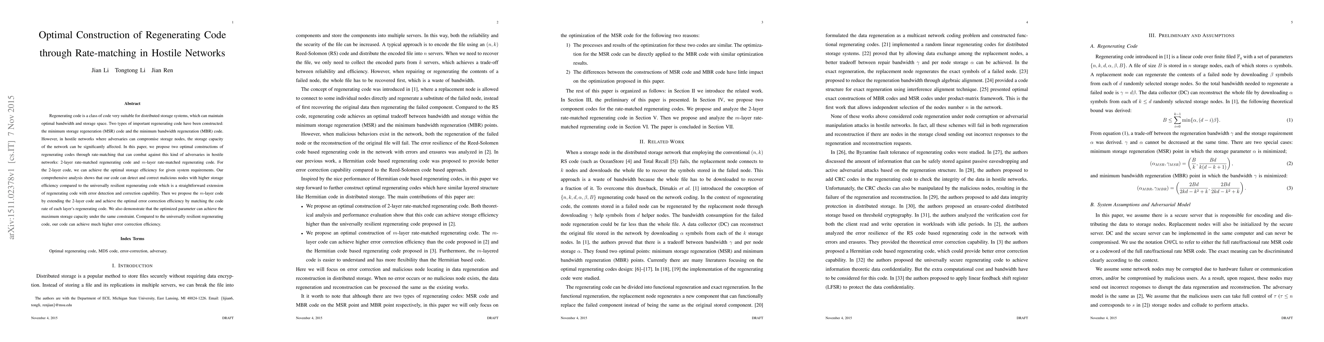 Regenerating code is a class of code very suitable for distributed storage systems, which can maintain optimal bandwidth and storage space. Two types of important regenerating code have been constructed: the minimum storage regeneration (MSR) code and the minimum bandwidth regeneration (MBR) code. However, in hostile networks where adversaries can compromise storage nodes, the storage capacity of the network can be significantly affected. In this paper, we propose two optimal constructions of regenerating codes through rate-matching that can combat against this kind of adversaries in hostile networks: 2-layer rate-matched regenerating code and $m$-layer rate-matched regenerating code. For the 2-layer code, we can achieve the optimal storage efficiency for given system requirements. Our comprehensive analysis shows that our code can detect and correct malicious nodes with higher storage efficiency compared to the universally resilient regenerating code which is a straightforward extension of regenerating code with error detection and correction capability. Then we propose the $m$-layer code by extending the 2-layer code and achieve the optimal error correction efficiency by matching the code rate of each layer's regenerating code. We also demonstrate that the optimized parameter can achieve the maximum storage capacity under the same constraint. Compared to the universally resilient regenerating code, our code can achieve much higher error correction efficiency.