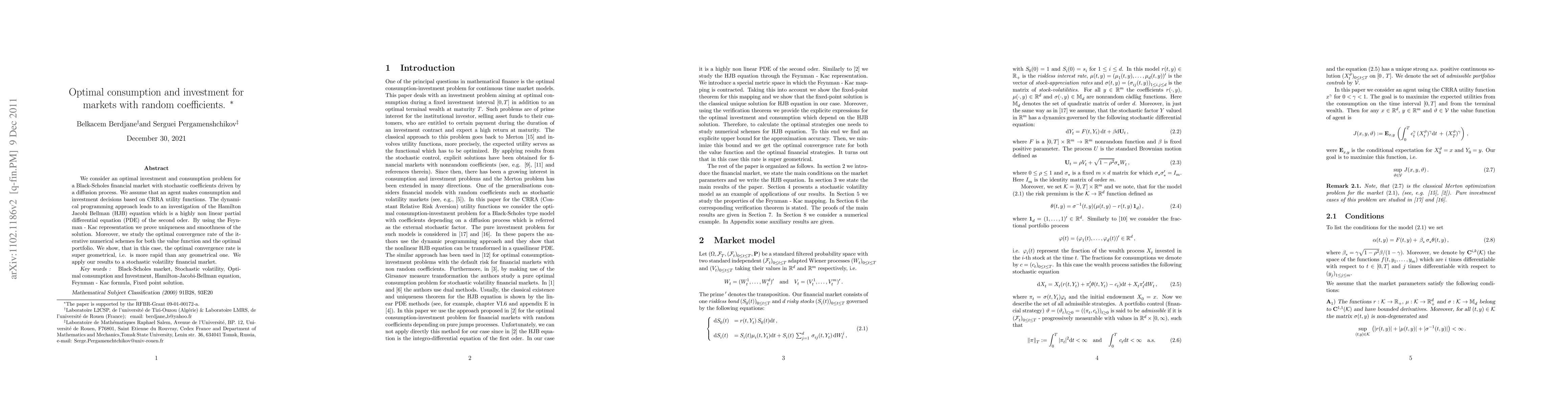 This paper investigates optimal consumption and investment strategies in a Black-Scholes market with stochastic coefficients, employing CRRA utility functions and solving the associated Hamilton-Jacobi-Bellman equation. It demonstrates the uniqueness and smoothness of the solution via the Feynman-Kac representation and proves a super geometrical convergence rate for numerical schemes.