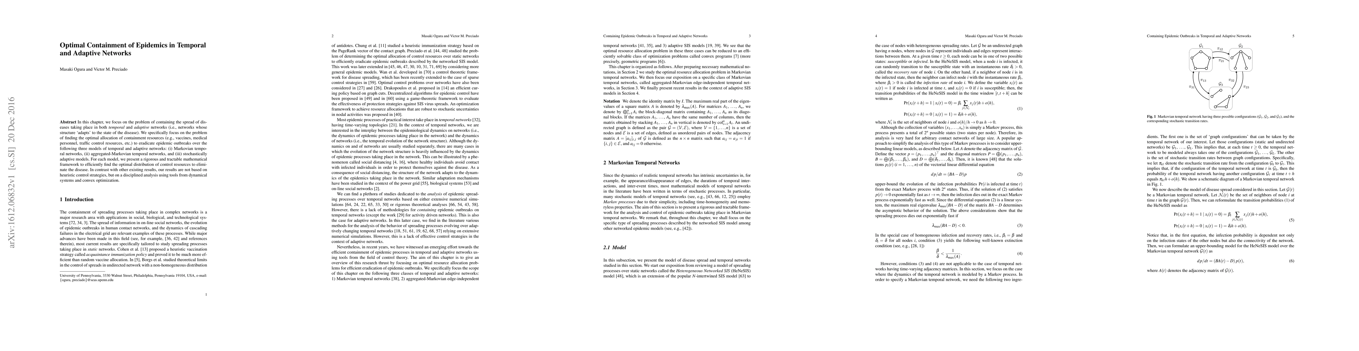 This research develops mathematical frameworks for optimally allocating resources to contain epidemics in temporal and adaptive networks, focusing on Markovian, aggregated-Markovian, and stochastically adaptive models. It employs rigorous dynamical systems and convex optimization techniques, providing optimal strategies beyond heuristic methods.