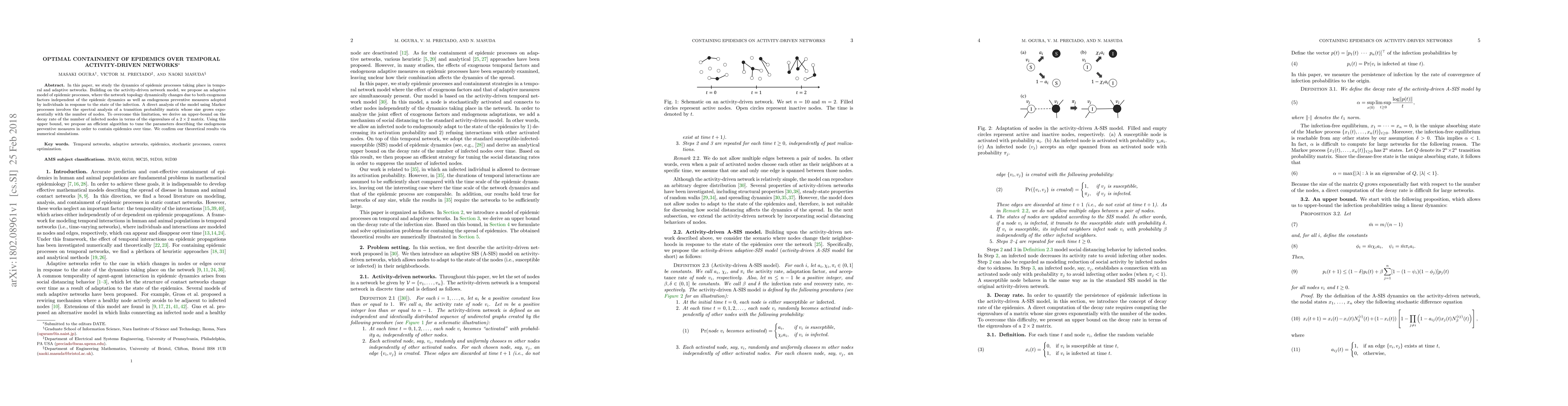 In this paper, we study the dynamics of epidemic processes taking place in temporal and adaptive networks. Building on the activity-driven network model, we propose an adaptive model of epidemic processes, where the network topology dynamically changes due to both exogenous factors independent of the epidemic dynamics as well as endogenous preventive measures adopted by individuals in response to the state of the infection. A direct analysis of the model using Markov processes involves the spectral analysis of a transition probability matrix whose size grows exponentially with the number of nodes. To overcome this limitation, we derive an upper-bound on the decay rate of the number of infected nodes in terms of the eigenvalues of a $2 \times 2$ matrix. Using this upper bound, we propose an efficient algorithm to tune the parameters describing the endogenous preventive measures in order to contain epidemics over time. We confirm our theoretical results via numerical simulations.