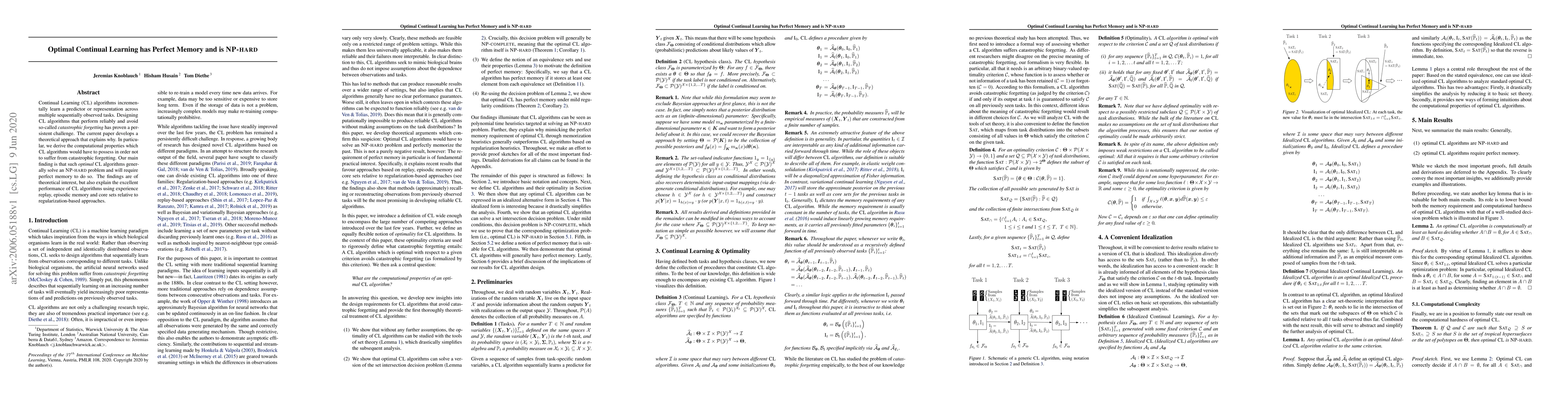 Optimal Continual Learning algorithms have perfect memory but are NP-hard to solve, explaining why they often outperform regularized approaches.