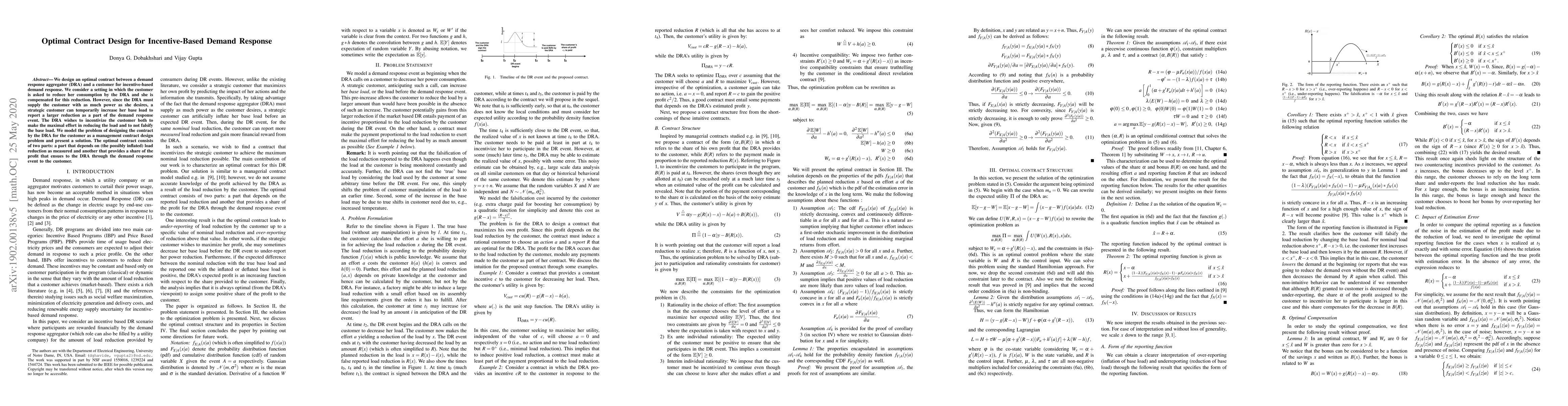 This paper designs an optimal contract for incentivizing customers to reduce their energy consumption in demand response programs while preventing manipulation of reported load reductions. The contract includes a performance-based component and a profit-sharing component to ensure both genuine effort and truthful reporting.