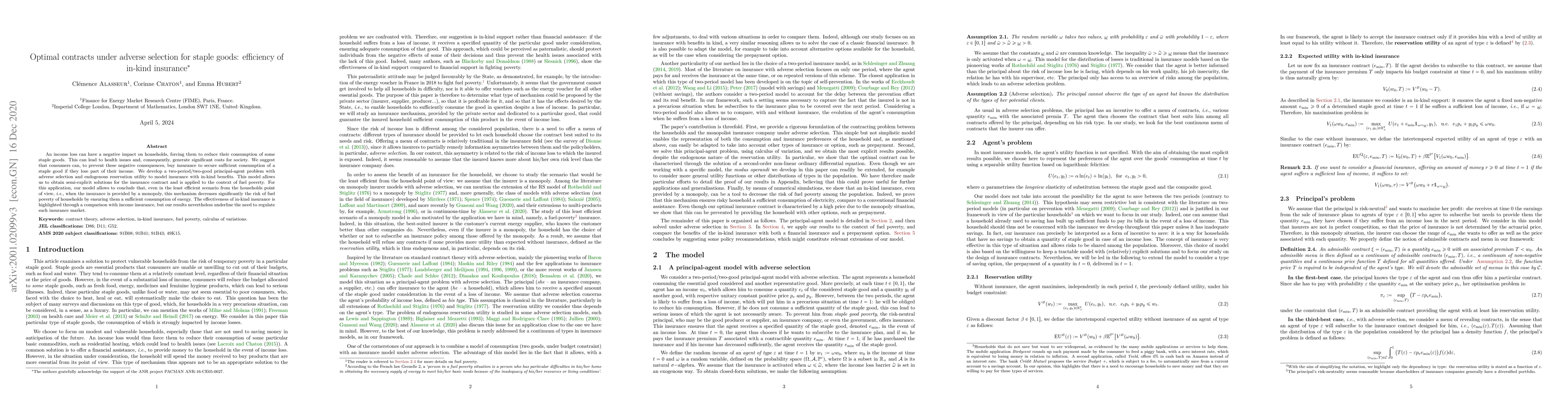 An income loss can have a negative impact on households, forcing them to reduce their consumption of some staple goods. This can lead to health issues and, consequently, generate significant costs for society. We suggest that consumers can, to prevent these negative consequences, buy insurance to secure sufficient consumption of a staple good if they lose part of their income. We develop a two-period/two-good principal-agent problem with adverse selection and endogenous reservation utility to model insurance with in-kind benefits. This model allows us to obtain semi-explicit solutions for the insurance contract and is applied to the context of fuel poverty. For this application, our model allows to conclude that, even in the least efficient scenario from the households point of view, i.e., when the insurance is provided by a monopoly, this mechanism decreases significantly the risk of fuel poverty of households by ensuring them a sufficient consumption of energy. The effectiveness of in-kind insurance is highlighted through a comparison with income insurance, but our results nevertheless underline the need to regulate such insurance market.