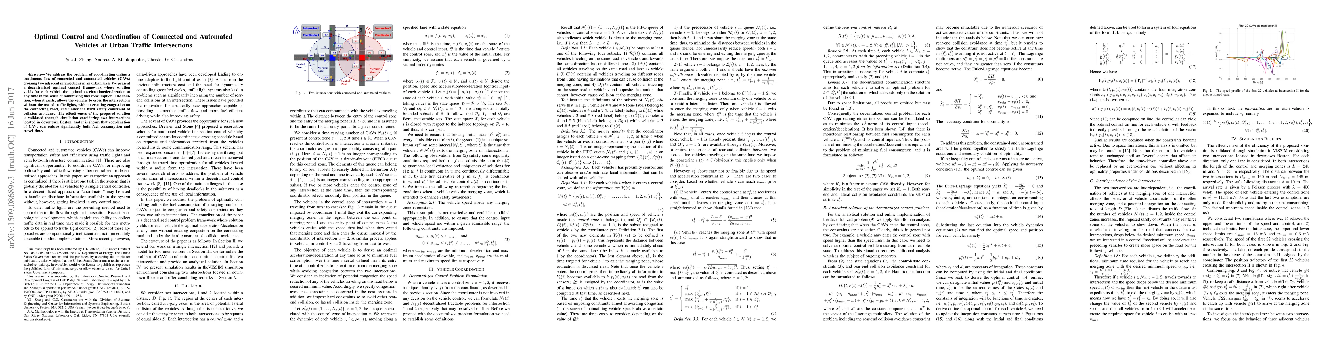 This paper presents a decentralized optimal control framework for coordinating connected and automated vehicles (CAVs) at urban intersections, aiming to minimize fuel consumption and avoid collisions without traffic lights. Simulation results in downtown Boston show significant reductions in both fuel consumption and travel time through CAV coordination.
