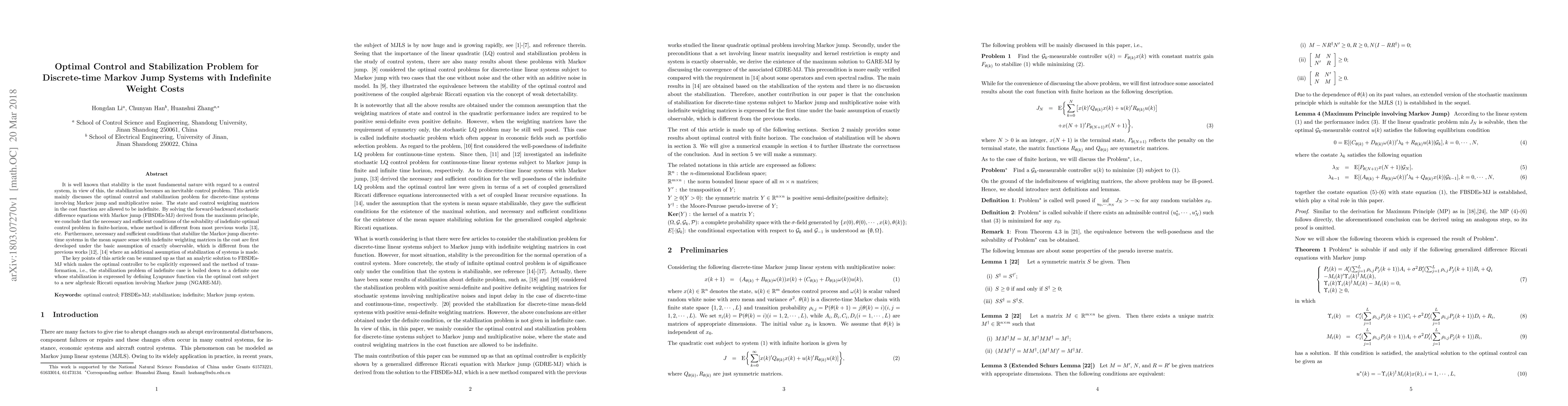 It is well known that stability is the most fundamental nature with regard to a control system, in view of this, the stabilization becomes an inevitable control problem. This article mainly discusses the optimal control and stabilization problem for discrete-time systems involving Markov jump and multiplicative noise. The state and control weighting matrices in the cost function are allowed to be indefinite. By solving the forward-backward stochastic difference equations with Markov jump (FBSDEs-MJ) derived from the maximum principle, we conclude that the necessary and sufficient conditions of the solvability of indefinite optimal control problem in finite-horizon, whose method is different from most previous works [13], etc. Furthermore, necessary and sufficient conditions that stabilize the Markov jump discrete- time systems in the mean square sense with indefinite weighting matrices in the cost are first developed under the basic assumption of exactly observable, which is different from the previous works [12], [14] where an additional assumption of stabilization of systems is made. The key points of this article can be summed up as that an analytic solution to FBSDEs- MJ which makes the optimal controller to be explicitly expressed and the method of trans- formation, i.e., the stabilization problem of indefinite case is boiled down to a definite one whose stabilization is expressed by defining Lyapunov function via the optimal cost subject to a new algebraic Riccati equation involving Markov jump (NGARE-MJ).