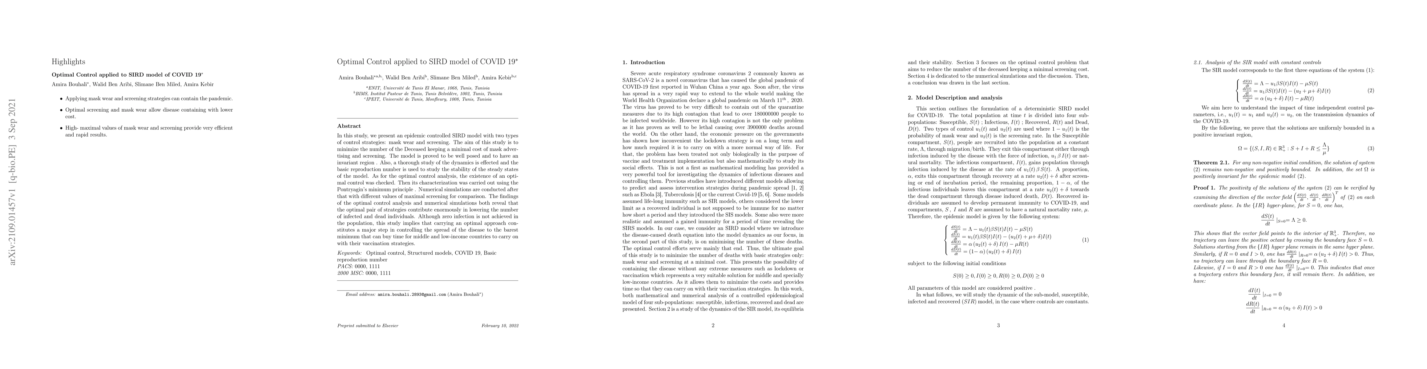 In this study, we present an epidemic-controlled SIRD model with two types of control strategies: mask wear and screening. The aim of this study is to minimize the number of deceased keeping a minimal cost of mask advertising and screening. The model is proved to be well-posed and to have an invariant region. Also, a thorough study of the dynamics is effected and the basic reproduction number is used to study the stability of the steady states of the model. As for the optimal control analysis, the existence of an optimal control was checked. Then its characterization was carried out using Pontryagin's minimum principle. Numerical simulations are conducted after that with different values of maximal screening for comparison. The findings of the optimal control analysis and numerical simulations both reveal that the optimal pair of strategies contribute enormously in lowering the number of infected and dead individuals. Although zero infection is not achieved in the population, this study implies that carrying an optimal approach constitutes a major step in controlling the spread of the disease to the barest minimum that can buy time for middle and low-income countries to carry on with their vaccination strategies.
