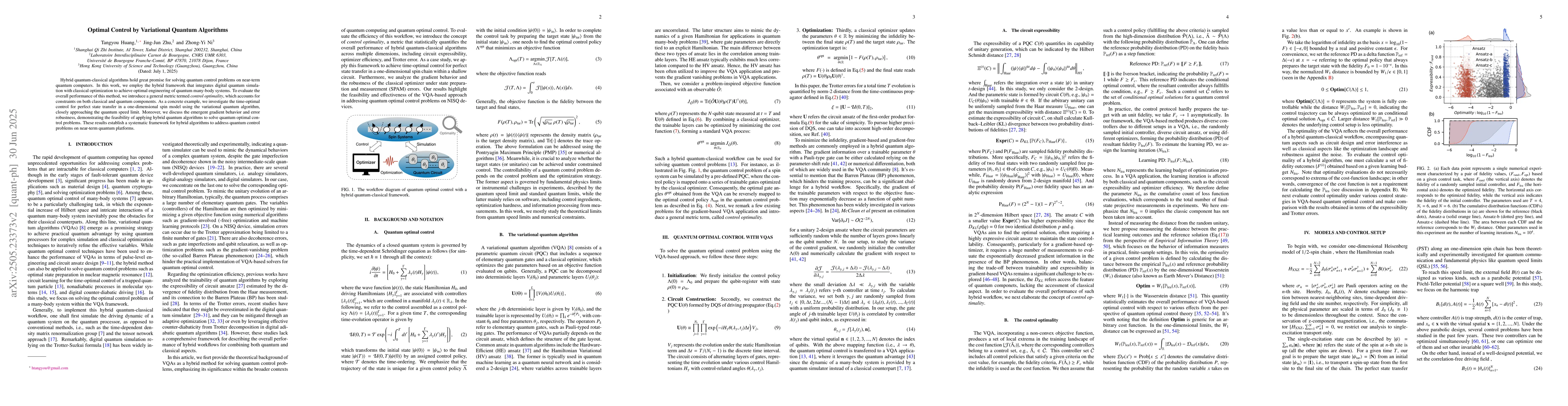 The introduction of a control optimality metric and the application of VQAs for time-optimal control in quantum many-body systems.