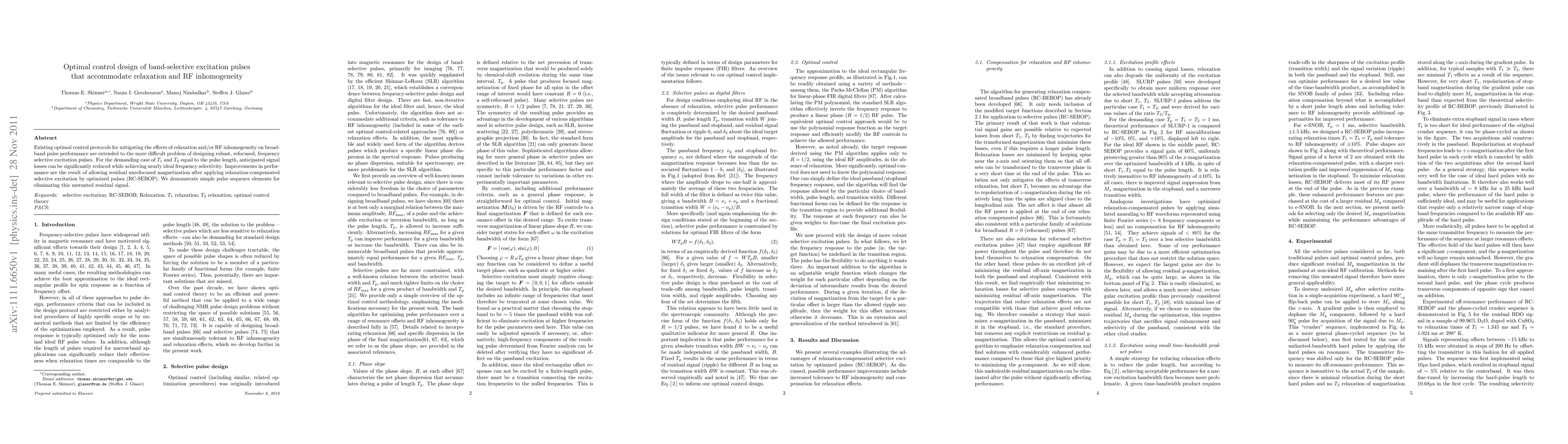 This paper extends optimal control protocols to design robust, refocused, frequency selective excitation pulses that accommodate relaxation and RF inhomogeneity, significantly reducing anticipated signal losses and achieving near-ideal frequency selectivity, even when T1 and T2 equal the pulse length. The authors propose simple pulse sequence elements to eliminate residual unrefocused magnetization after applying optimized pulses.