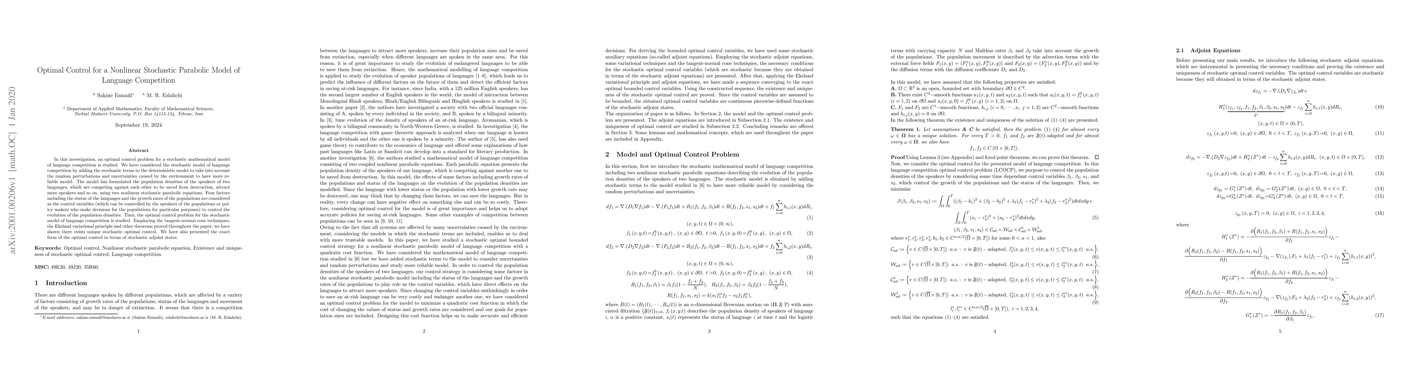 This research paper studies optimal control for a stochastic model of language competition, aiming to minimize the risk of language extinction by controlling population growth rates and linguistic status.
