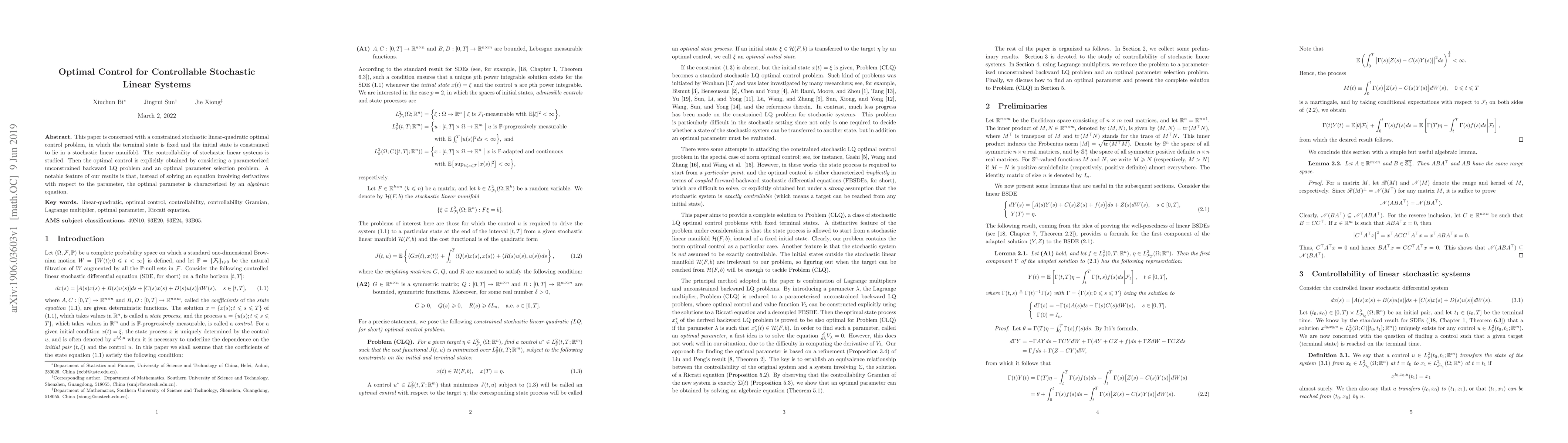 This paper is concerned with a constrained stochastic linear-quadratic optimal control problem, in which the terminal state is fixed and the initial state is constrained to lie in a stochastic linear manifold. The controllability of stochastic linear systems is studied. Then the optimal control is explicitly obtained by considering a parameterized unconstrained backward LQ problem and an optimal parameter selection problem. A notable feature of our results is that, instead of solving an equation involving derivatives with respect to the parameter, the optimal parameter is characterized by an algebraic equation.