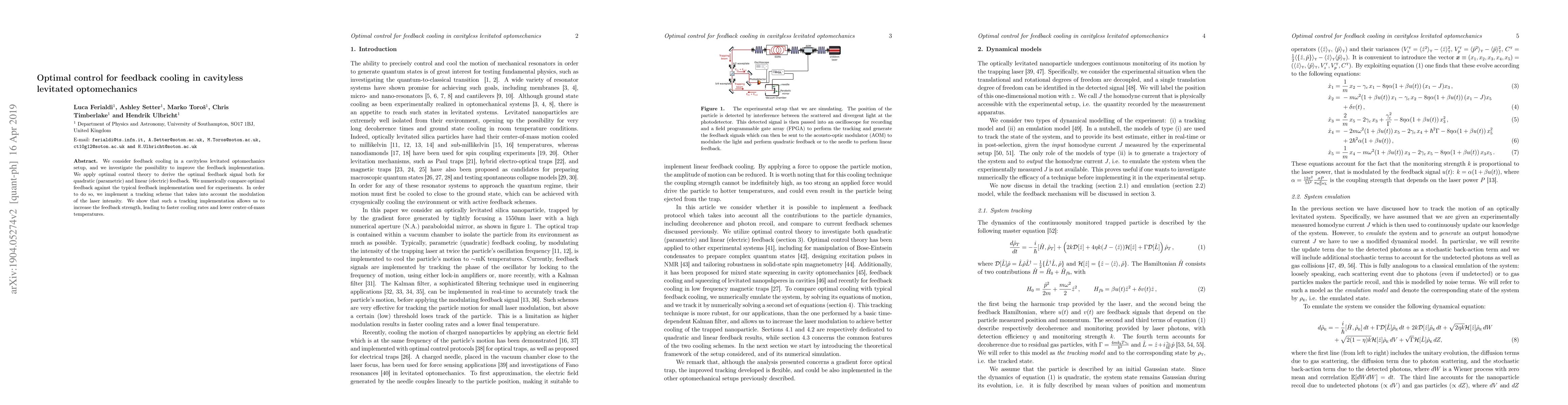 We consider feedback cooling in a cavityless levitated optomechanics setup, and we investigate the possibility to improve the feedback implementation. We apply optimal control theory to derive the optimal feedback signal both for quadratic (parametric) and linear (electric) feedback. We numerically compare optimal feedback against the typical feedback implementation used for experiments. In order to do so, we implement a tracking scheme that takes into account the modulation of the laser intensity. We show that such a tracking implementation allows us to increase the feedback strength, leading to faster cooling rates and lower center-of-mass temperatures.