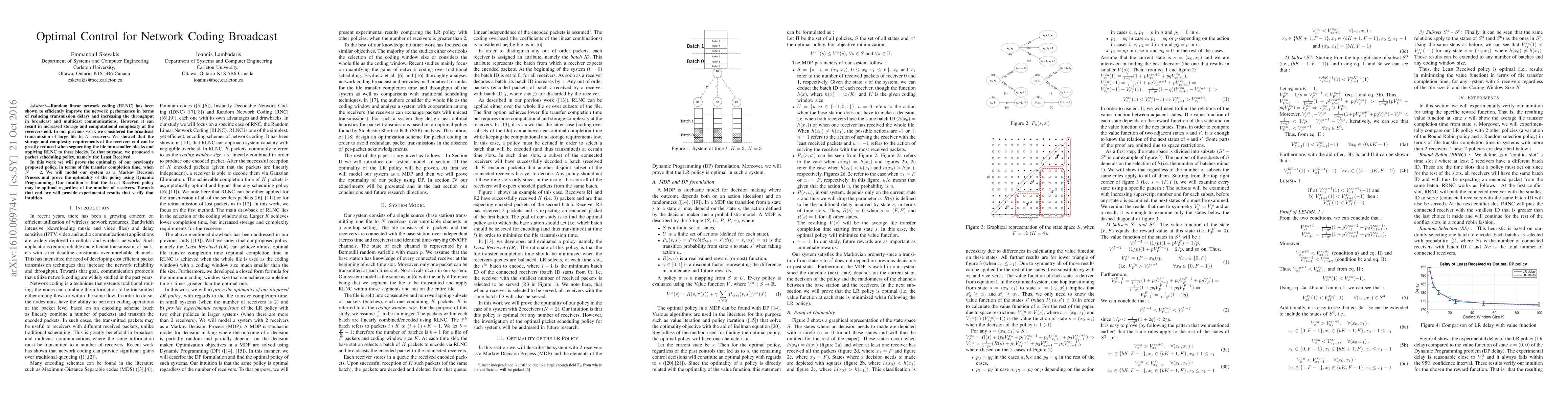 Random linear network coding (RLNC) has been shown to efficiently improve the network performance in terms of reducing transmission delays and increasing the throughput in broadcast and multicast communications. However, it can result in increased storage and computational complexity at the receivers end. In our previous work we considered the broadcast transmission of large file to N receivers. We showed that the storage and complexity requirements at the receivers end can be greatly reduced when segmenting the file into smaller blocks and applying RLNC to these blocks. To that purpose, we proposed a packet scheduling policy, namely the Least Received. In this work we will prove the optimality of our previously proposed policy, in terms of file transfer completion time, when N = 2. We will model our system as a Markov Decision Process and prove the optimality of the policy using Dynamic Programming. Our intuition is that the Least Received policy may be optimal regardless of the number of receivers. Towards that end, we will provide experimental results that verify that ntuition.