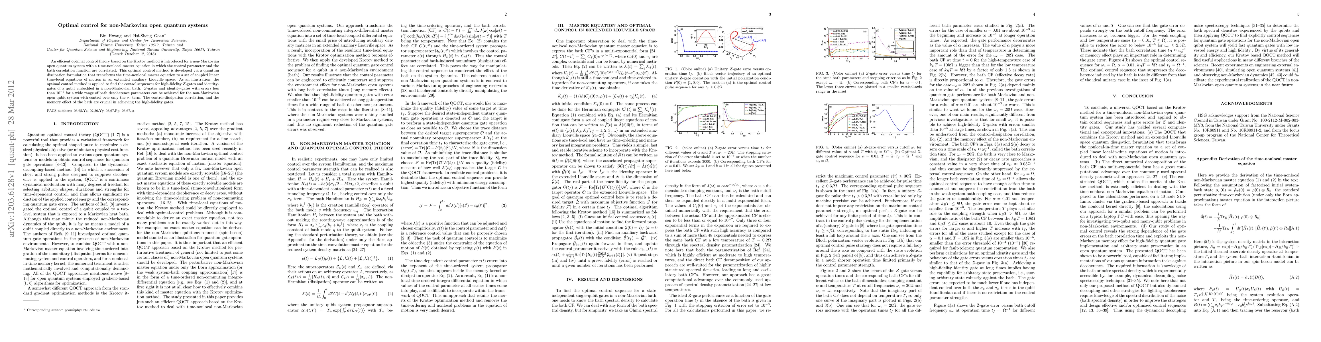 This paper introduces an optimal-control theory for non-Markovian open quantum systems using the Krotov method, transforming time-nonlocal master equations into linear time-local equations. The method achieves high-fidelity Z and identity gates for qubits in non-Markovian baths, highlighting the importance of control-dissipation correlation and memory effects.