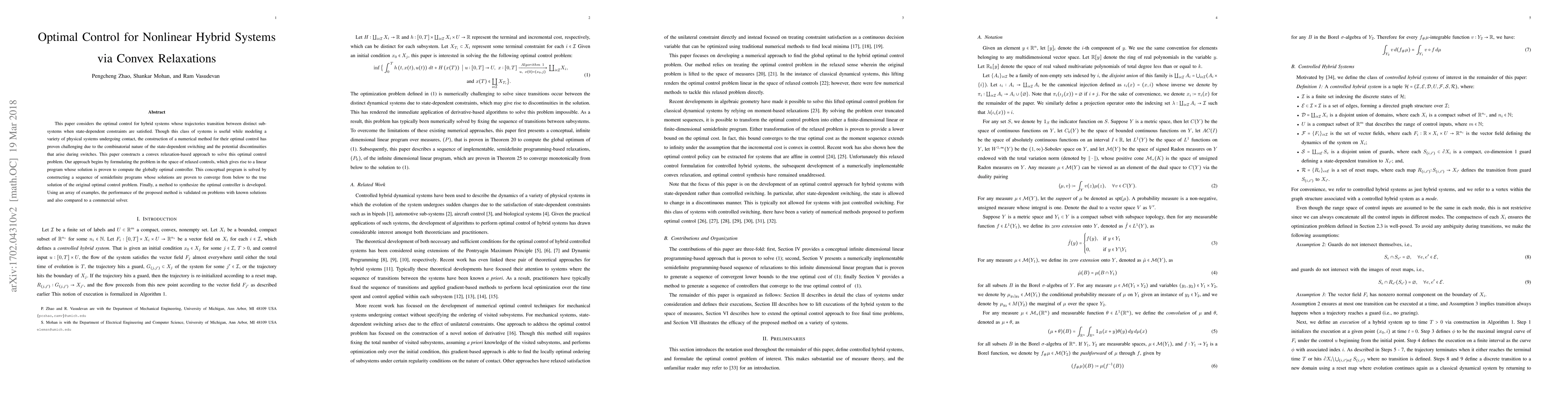 This paper proposes a convex relaxation-based method for optimal control of nonlinear hybrid systems, transforming the problem into a sequence of semidefinite programs that converge to the globally optimal solution. The approach is validated through examples and compared to commercial solvers.