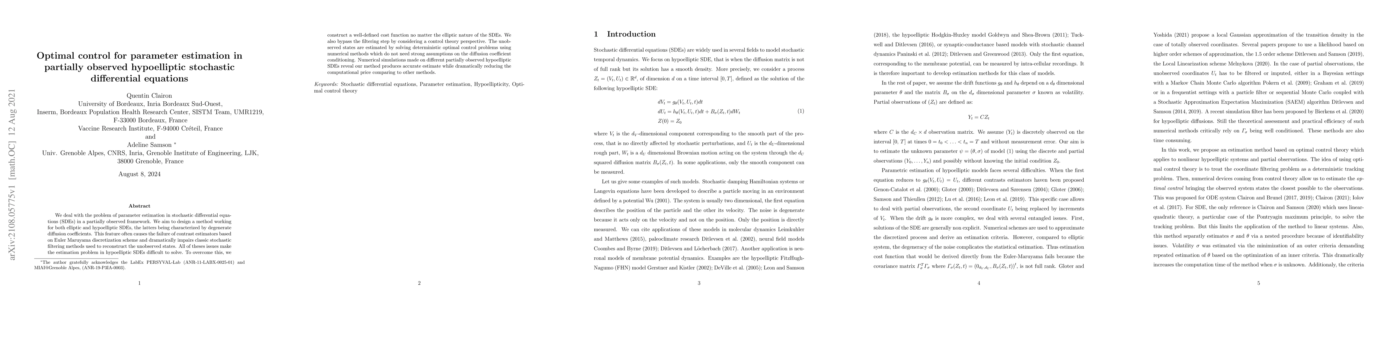 This paper proposes a novel optimal control method for parameter estimation in partially observed hypoelliptic stochastic differential equations (SDEs). It overcomes challenges posed by degenerate diffusion coefficients by bypassing traditional filtering methods and instead solving deterministic optimal control problems, resulting in accurate estimates with lower computational costs.