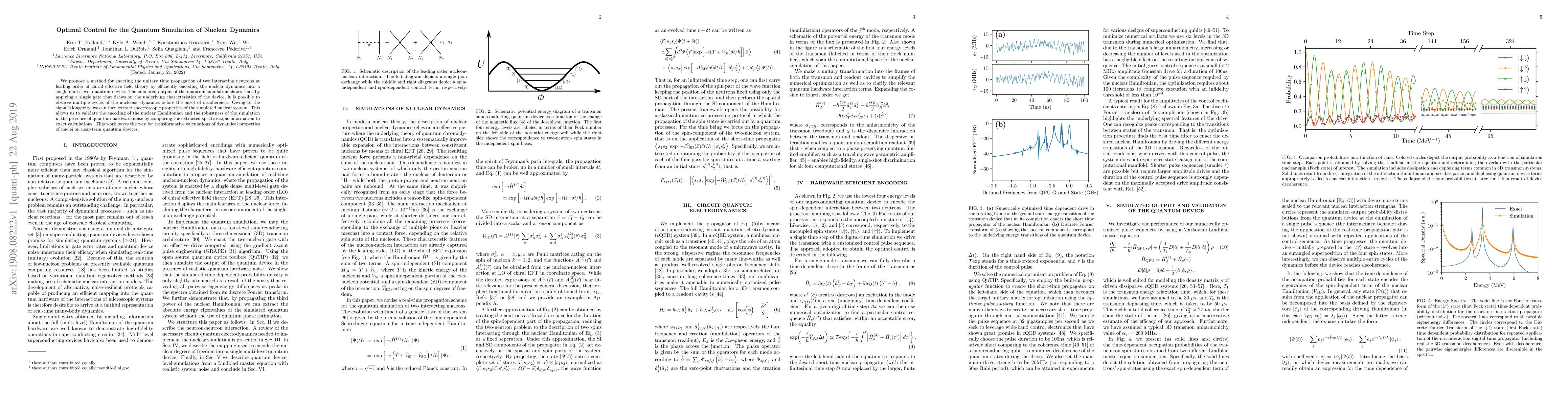 We propose a method for enacting the unitary time propagation of two interacting neutrons at leading order of chiral effective field theory by efficiently encoding the nuclear dynamics into a single multi-level quantum device. The emulated output of the quantum simulation shows that, by applying a single gate that draws on the underlying characteristics of the device, it is possible to observe multiple cycles of the nucleons' dynamics before the onset of decoherence. Owing to the signal's longevity, we can then extract spectroscopic properties of the simulated nuclear system. This allows us to validate the encoding of the nuclear Hamiltonian and the robustness of the simulation in the presence of quantum-hardware noise by comparing the extracted spectroscopic information to exact calculations. This work paves the way for transformative calculations of dynamical properties of nuclei on near-term quantum devices.