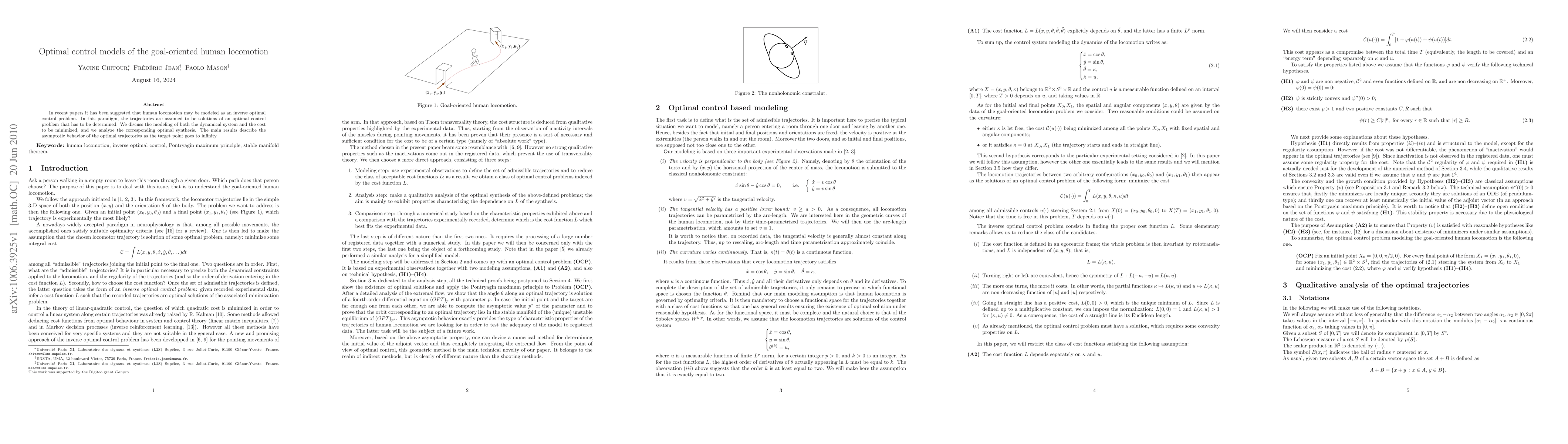 In recent papers it has been suggested that human locomotion may be modeled as an inverse optimal control problem. In this paradigm, the trajectories are assumed to be solutions of an optimal control problem that has to be determined. We discuss the modeling of both the dynamical system and the cost to be minimized, and we analyze the corresponding optimal synthesis. The main results describe the asymptotic behavior of the optimal trajectories as the target point goes to infinity.