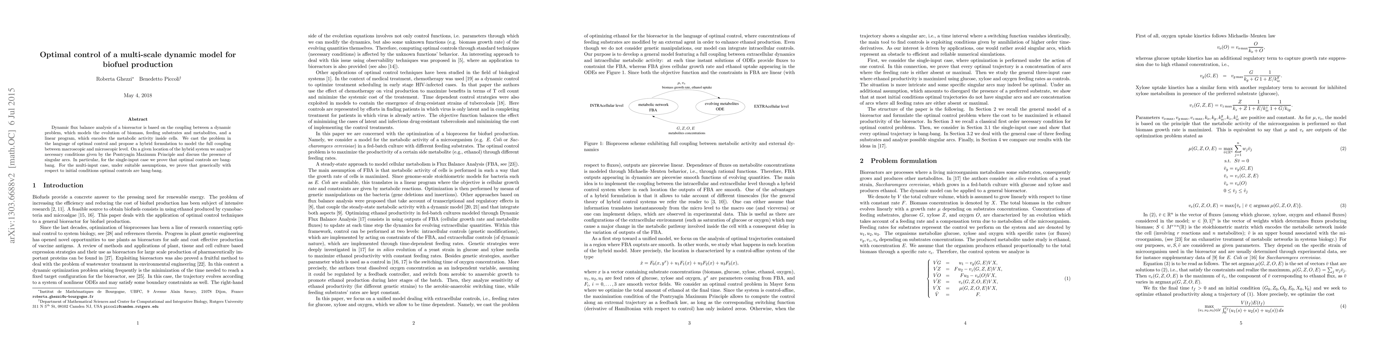 Dynamic flux balance analysis of a bioreactor is based on the coupling between a dynamic problem, which models the evolution of biomass, feeding substrates and metabolites, and a linear program, which encodes the metabolic activity inside cells. We cast the problem in the language of optimal control and propose a hybrid formulation to model the full coupling between macroscopic and microscopic level. On a given location of the hybrid system we analyze necessary conditions given by the Pontryagin Maximum Principle and discuss the presence of singular arcs. In particular, for the single-input case we prove that optimal controls are bang-bang. For the multi-input case, under suitable assumptions, we prove that generically with respect to initial conditions optimal controls are bang-bang.