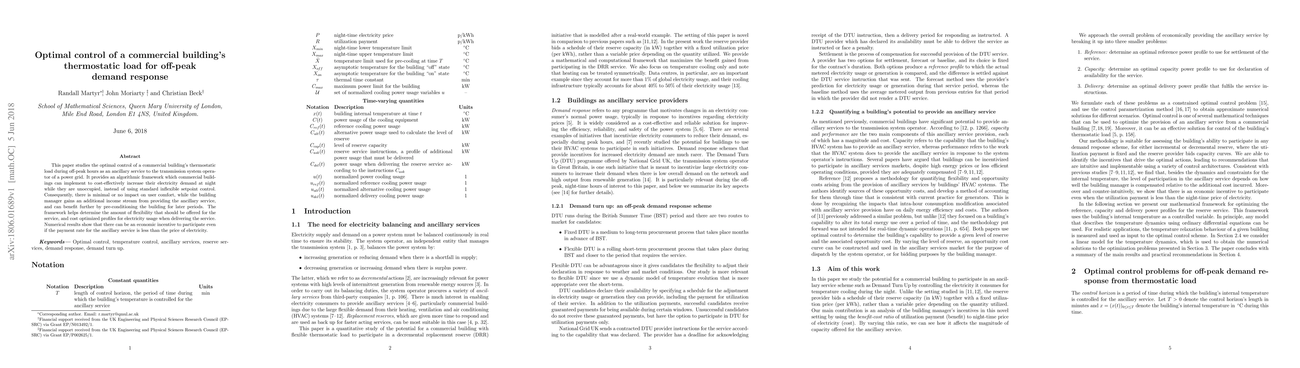 This paper studies the optimal control of a commercial building's thermostatic load during off-peak hours as an ancillary service to the transmission system operator of a power grid. It provides an algorithmic framework which commercial buildings can implement to cost-effectively increase their electricity demand at night while they are unoccupied, instead of using standard inflexible setpoint control. Consequently, there is minimal or no impact on user comfort, while the building manager gains an additional income stream from providing the ancillary service, and can benefit further by pre-conditioning the building for later periods. The framework helps determine the amount of flexibility that should be offered for the service, and cost optimized profiles for electricity usage when delivering the service. Numerical results show that there can be an economic incentive to participate even if the payment rate for the ancillary service is less than the price of electricity.
