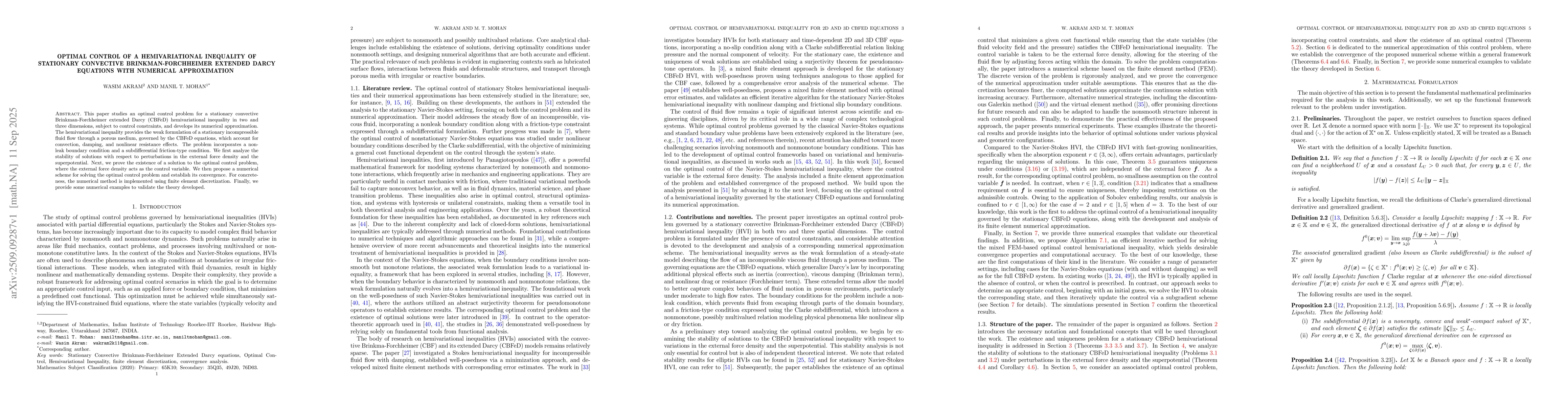 This paper studies an optimal control problem for a stationary convective Brinkman-Forchheimer extended Darcy (CBFeD) hemivariational inequality in two and three dimensions, subject to control constraints, and develops its numerical approximation. The hemivariational inequality provides the weak formulation of a stationary incompressible fluid flow through a porous medium, governed by the CBFeD equations, which account for convection, damping, and nonlinear resistance effects. The problem incorporates a non-leak boundary condition and a subdifferential friction-type condition. We first analyze the stability of solutions with respect to perturbations in the external force density and the superpotential. Next, we prove the existence of a solution to the optimal control problem, where the external force density acts as the control variable. We then propose a numerical scheme for solving the optimal control problem and establish its convergence. For concreteness, the numerical method is implemented using finite element discretization. Finally, we provide some numerical examples to validate the theory developed.