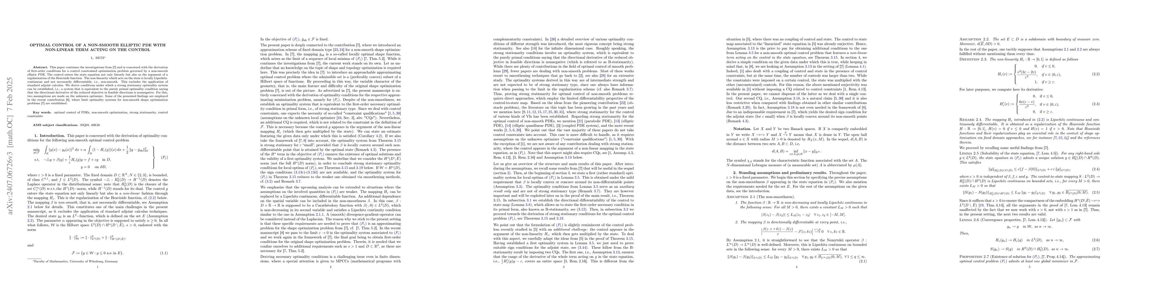 This paper continues the investigations from [7] and is concerned with the derivation of first-order conditions for a control constrained optimization problem governed by a non-smooth elliptic PDE. The control enters the state equation not only linearly but also as the argument of a regularization of the Heaviside function. The non-linearity which acts on the state is locally Lipschitz-continuous and not necessarily differentiable, i.e., non-smooth. This excludes the application of standard adjoint calculus. We derive conditions under which a strong stationary optimality system can be established, i.e., a system that is equivalent to the purely primal optimality condition saying that the directional derivative of the reduced objective in feasible directions is nonnegative. For this, two assumptions are made on the unknown optimizer. These are fulfilled if the non-smoothness is locally convex around its non-differentiable points and if an estimate involving only the given data is true. Some of the presented findings are employed in the recent contribution [8], where limit optimality systems for non-smooth shape optimization problems [7] are established.