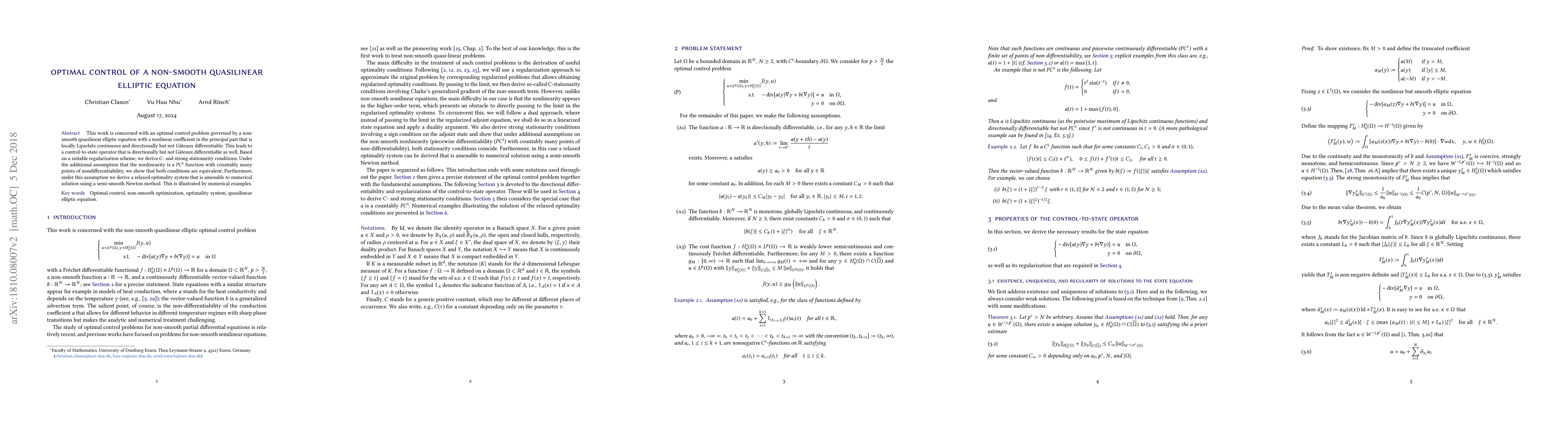 This work is concerned with an optimal control problem governed by a non-smooth quasilinear elliptic equation with a nonlinear coefficient in the principal part that is locally Lipschitz continuous and directionally but not G\^ateaux differentiable. This leads to a control-to-state operator that is directionally but not G\^ateaux differentiable as well. Based on a suitable regularization scheme, we derive C- and strong stationarity conditions. Under the additional assumption that the nonlinearity is a PC^1 function with countably many points of nondifferentiability, we show that both conditions are equivalent. Furthermore, under this assumption we derive a relaxed optimality system that is amenable to numerical solution using a semi-smooth Newton method. This is illustrated by numerical examples.