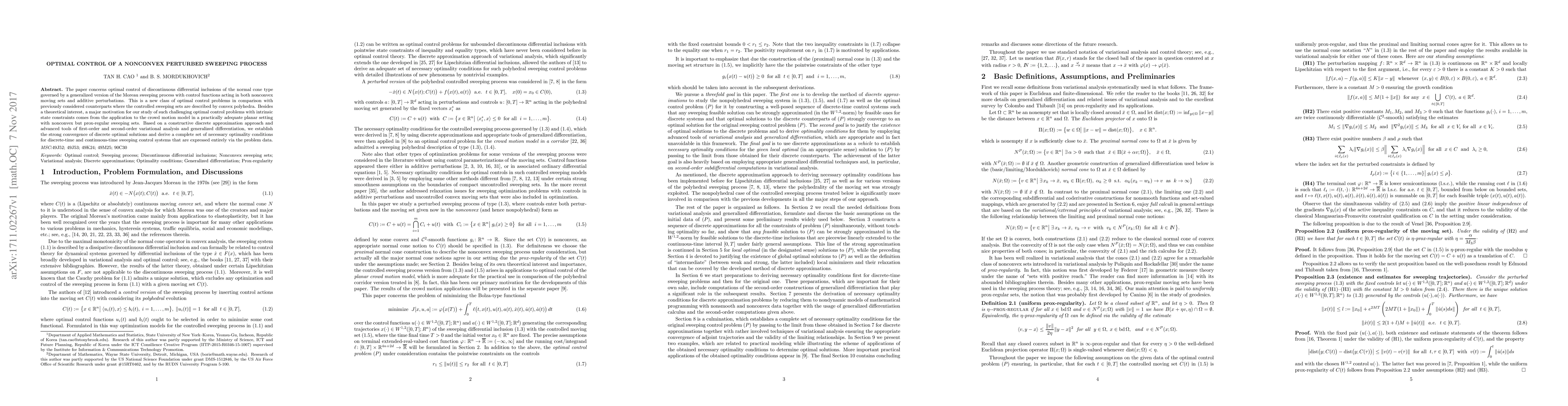 This paper develops optimal control theory for nonconvex perturbed sweeping processes, introducing new classes of discontinuous differential inclusions. It establishes necessary optimality conditions and proves strong convergence of discrete optimal solutions, motivated by applications to crowd motion models with nonconvex constraints.