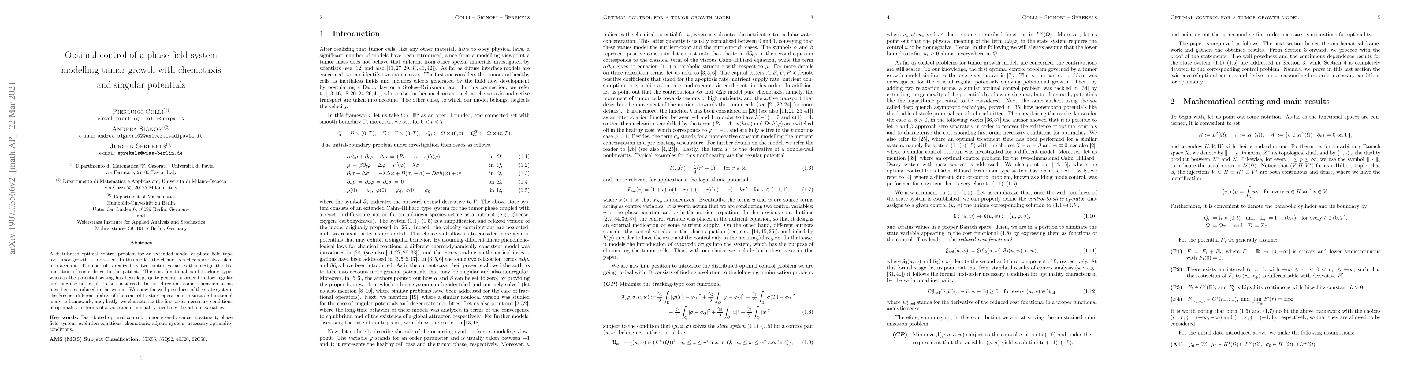 This paper addresses optimal control of a phase field model for tumor growth, incorporating chemotaxis and general potentials. The control involves drug dispensation, aiming to minimize a tracking cost functional, and it establishes well-posedness and necessary optimality conditions through variational inequalities.