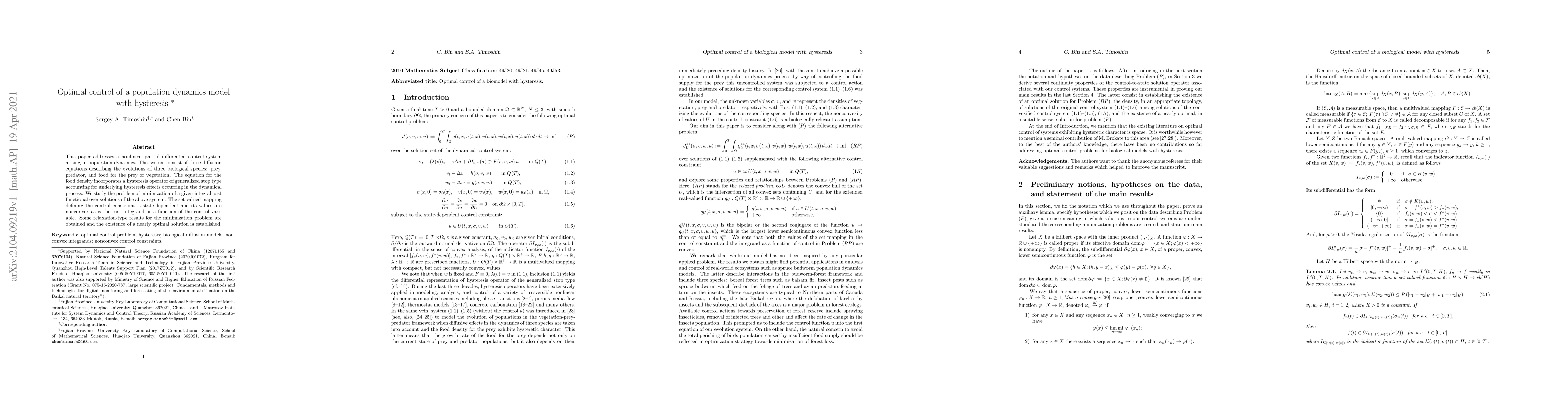 This paper addresses a nonlinear partial differential control system arising in population dynamics. The system consist of three diffusion equations describing the evolutions of three biological species: prey, predator, and food for the prey or vegetation. The equation for the food density incorporates a hysteresis operator of generalized stop type accounting for underlying hysteresis effects occurring in the dynamical process. We study the problem of minimization of a given integral cost functional over solutions of the above system. The set-valued mapping defining the control constraint is state-dependent and its values are nonconvex as is the cost integrand as a function of the control variable. Some relaxation-type results for the minimization problem are obtained and the existence of a nearly optimal solution is established.